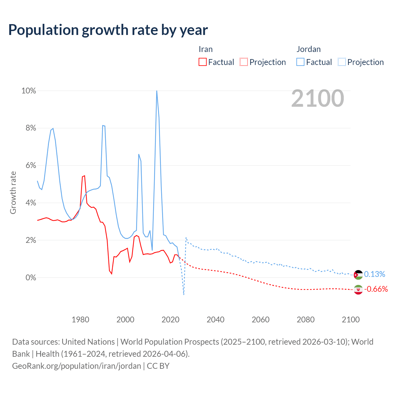 - For the last 10 years, Iran has had an average growth rate of +1.19% per year vs +3.45% in Jordan.