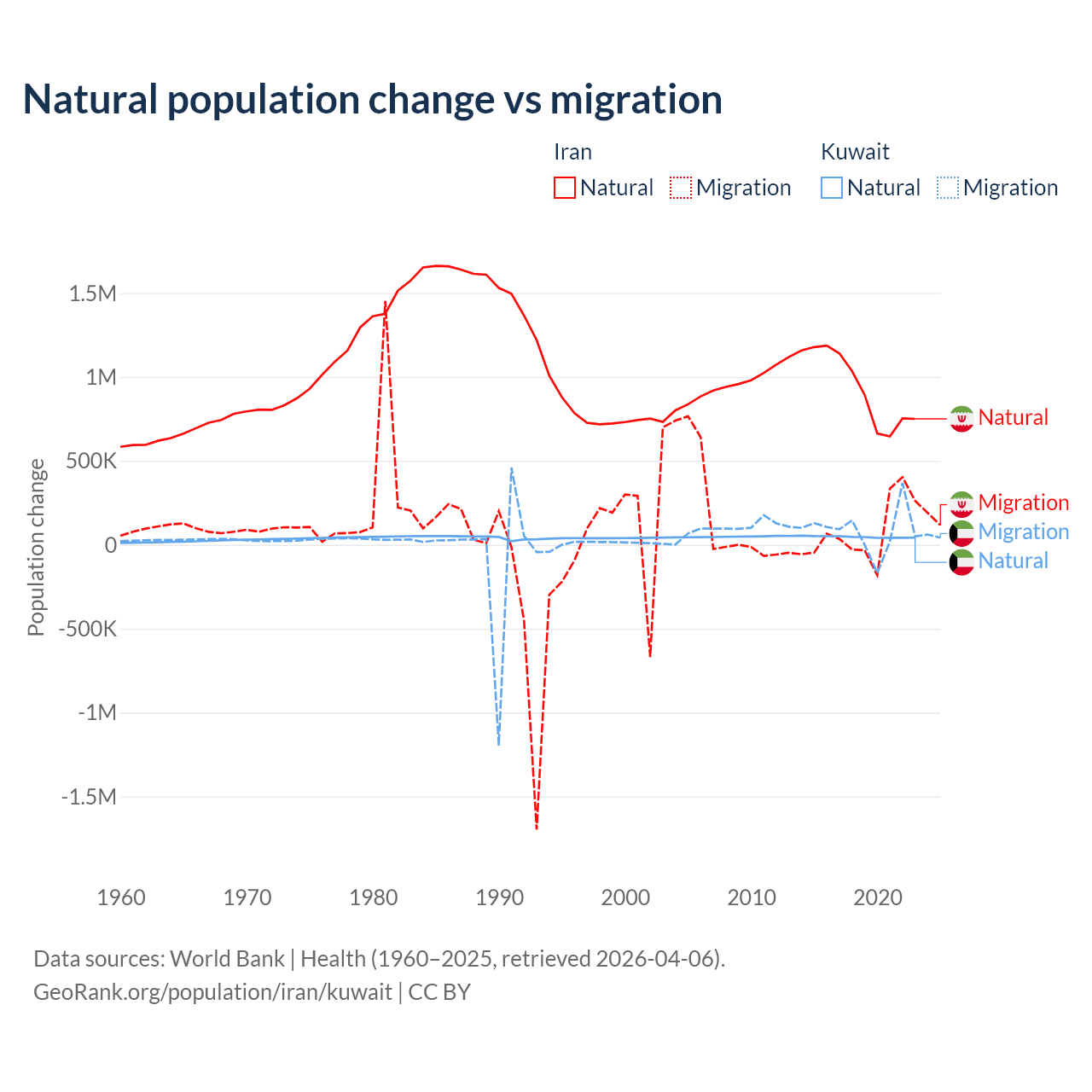 Over the last 10 years, 92.5% of the population change in Iran is from natural causes (a gain of 9,405,860 people) and 7.46% is from migration (a gain of 757,979 people). In Kuwait 35.8% is from natural causes (a gain of 470,645 people) and 64.2% is from migration (a gain of 845,142 people).