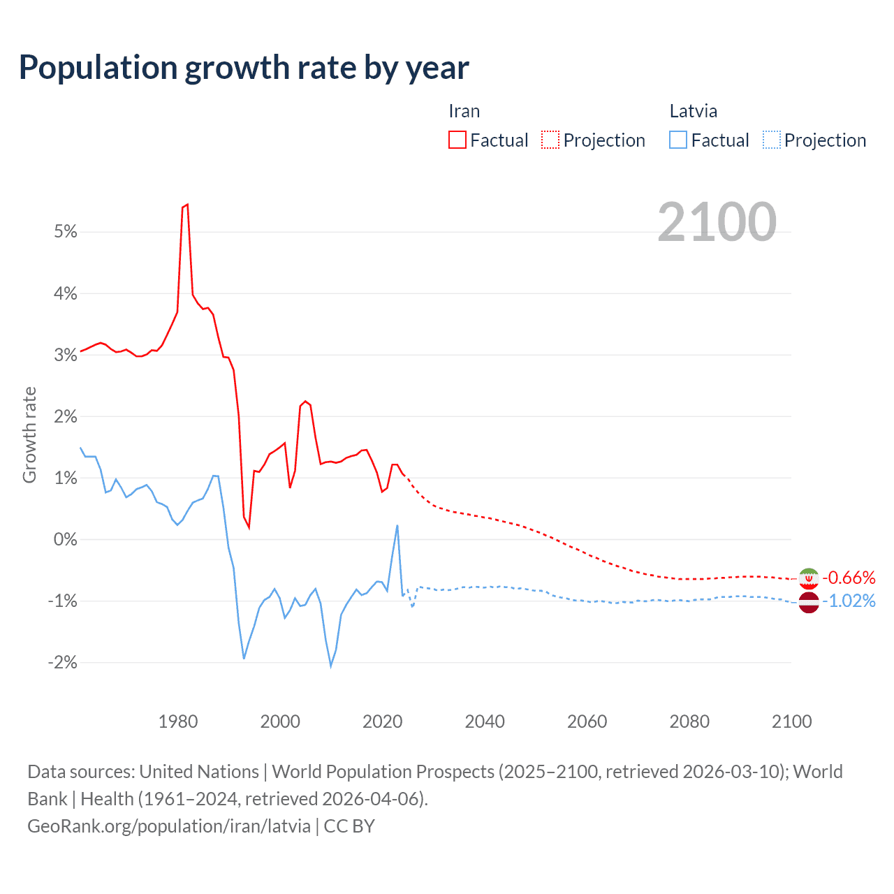 Data sources: World Bank | Health (1960–2024, retrieved 2026-04-06); United Nations | World Population Prospects (1960–2026, retrieved 2026-03-10); U.S. Census Bureau (1960–2025, retrieved 2026-02-08); Central Intelligence Agency (CIA) (2000–2019, retrieved 2026-02-20).