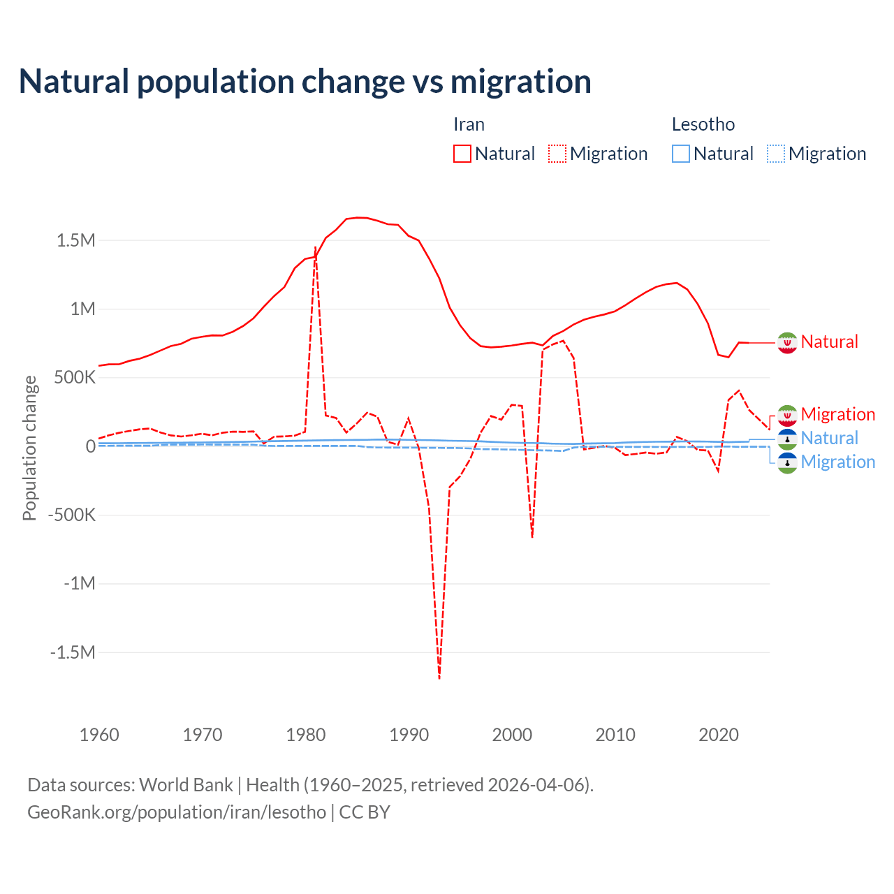 Over the last 10 years, 92.5% of the population change in Iran is from natural causes (a gain of 9,405,860 people) and 7.46% is from migration (a gain of 757,979 people). In Lesotho 84.2% is from natural causes (a gain of 315,836 people) and 15.8% is from migration (a loss of 59,457 people).