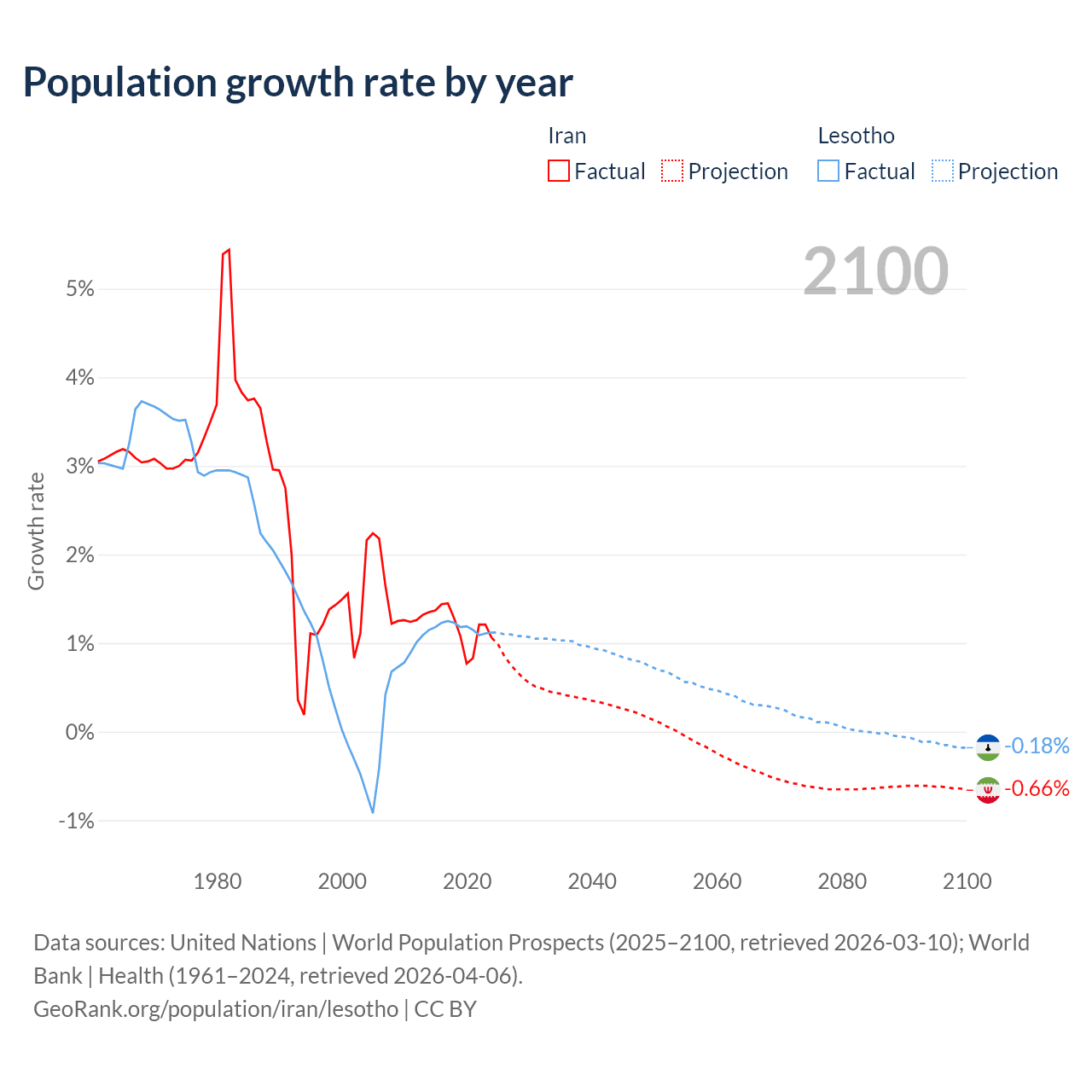 - For the last 10 years, Iran has had an average growth rate of +1.19% per year vs +1.17% in Lesotho.