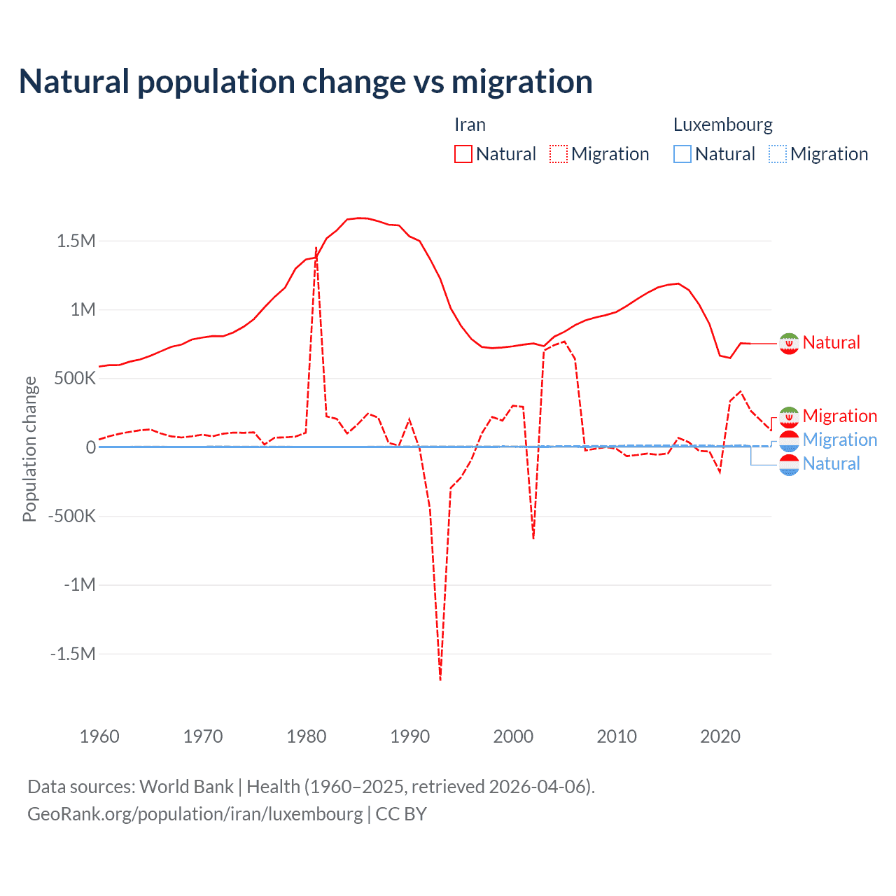 Over the last 10 years, 92.5% of the population change in Iran is from natural causes (a gain of 9,405,860 people) and 7.46% is from migration (a gain of 757,979 people). In Luxembourg 16.8% is from natural causes (a gain of 20,287 people) and 83.2% is from migration (a gain of 100,435 people).