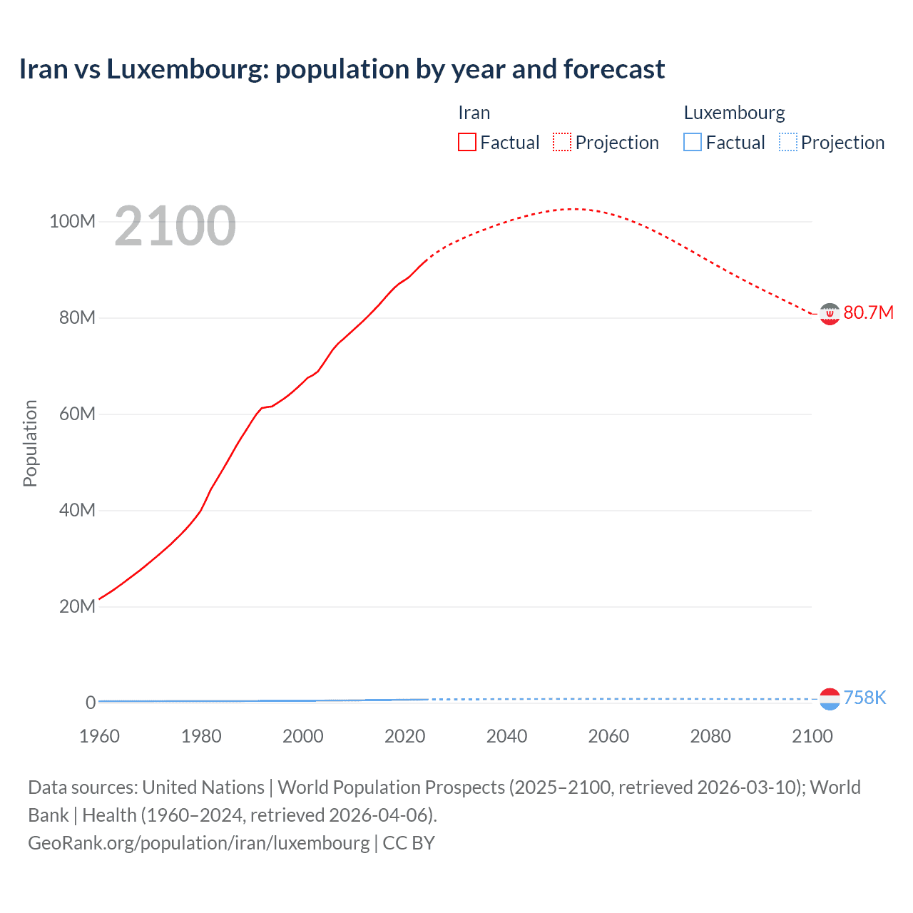The latest officially reported population of Iran was 91,567,738 in 2024 vs 677,012 people in Luxembourg in 2024. In 2026, based on the adjusted UN estimation, the current Iran's population is 93,468,444 people compared to 693,885 in Luxembourg.