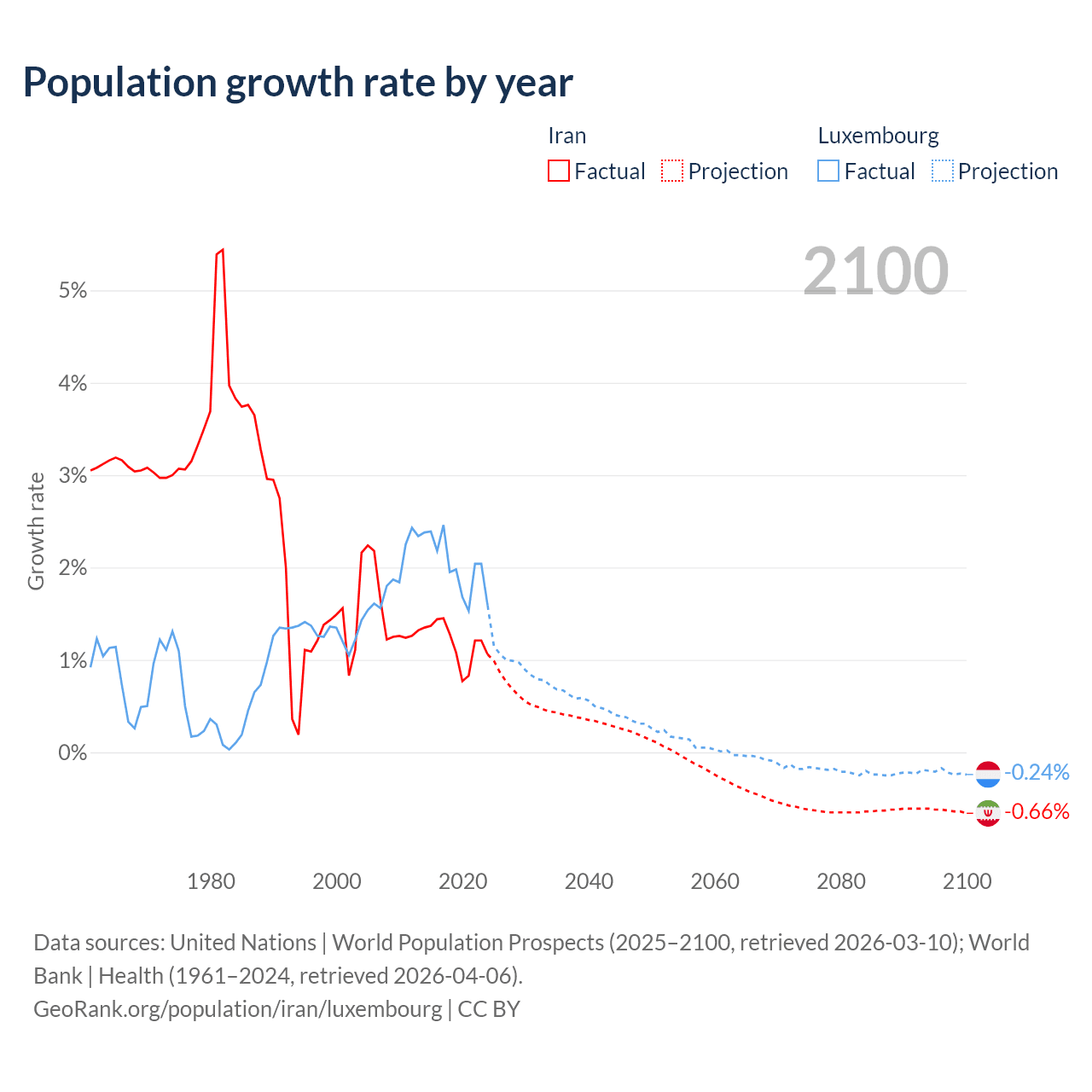 - For the last 10 years, Iran has had an average growth rate of +1.19% per year vs +2.02% in Luxembourg.