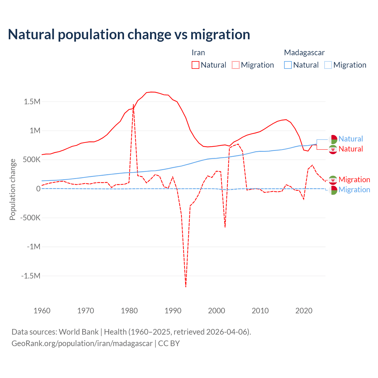 Over the last 10 years, 92.5% of the population change in Iran is from natural causes (a gain of 9,405,860 people) and 7.46% is from migration (a gain of 757,979 people). In Madagascar 99.7% is from natural causes (a gain of 7,165,578 people) and 0.31% is from migration (a loss of 22,384 people).