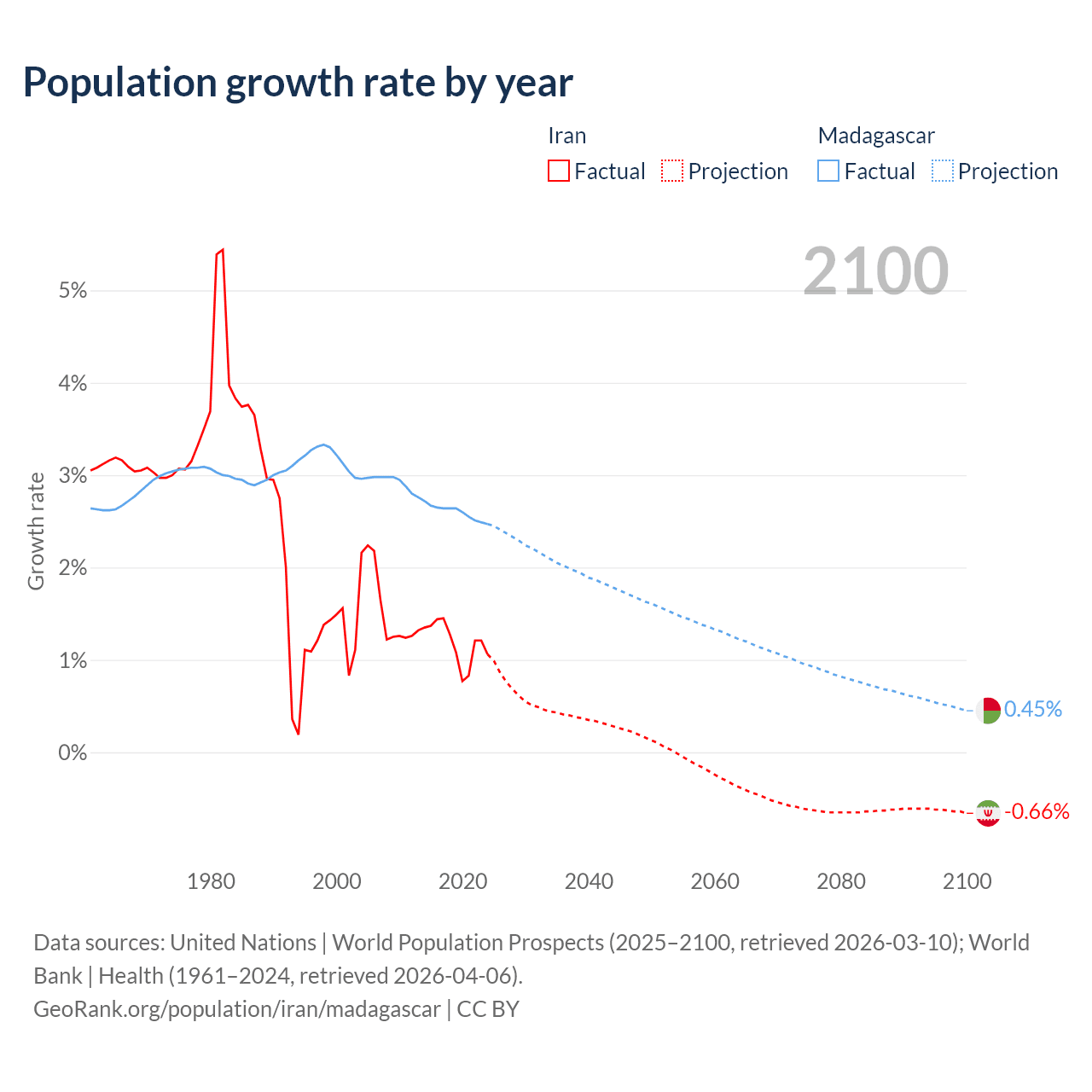 - For the last 10 years, Iran has had an average growth rate of +1.19% per year vs +2.6% in Madagascar.