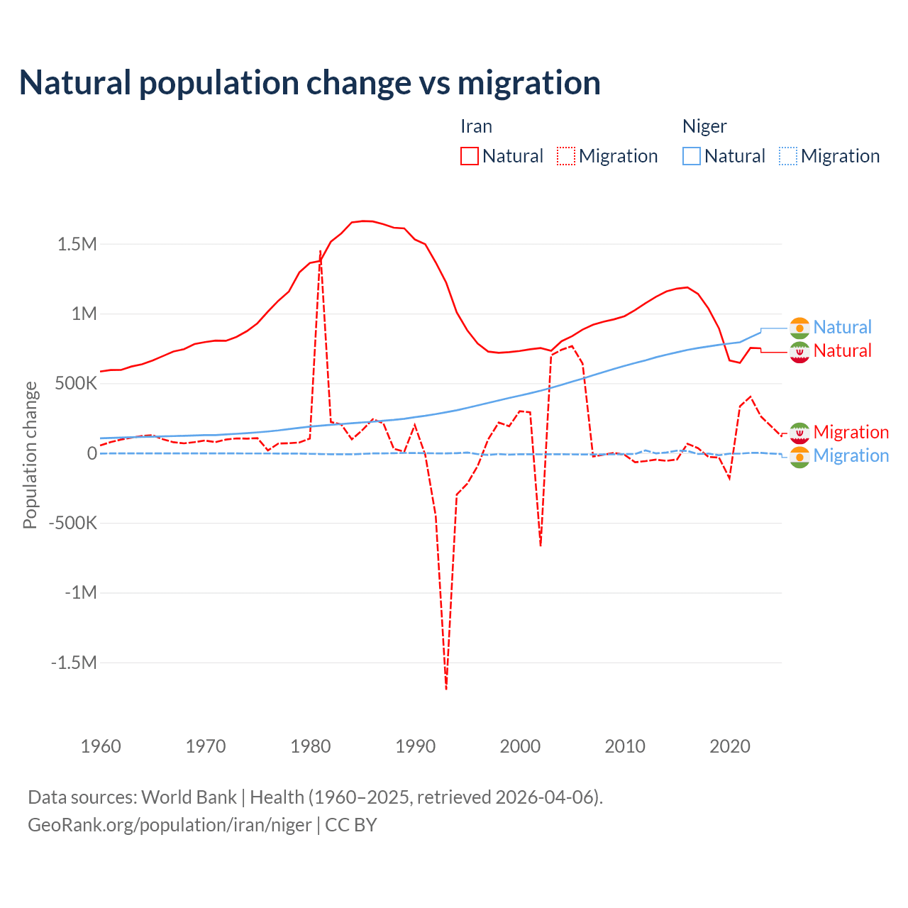 Over the last 10 years, 92.5% of the population change in Iran is from natural causes (a gain of 9,405,860 people) and 7.46% is from migration (a gain of 757,979 people). In Niger 100% is from natural causes (a gain of 7,728,287 people) and 0.03% is from migration (a gain of 2,520 people).