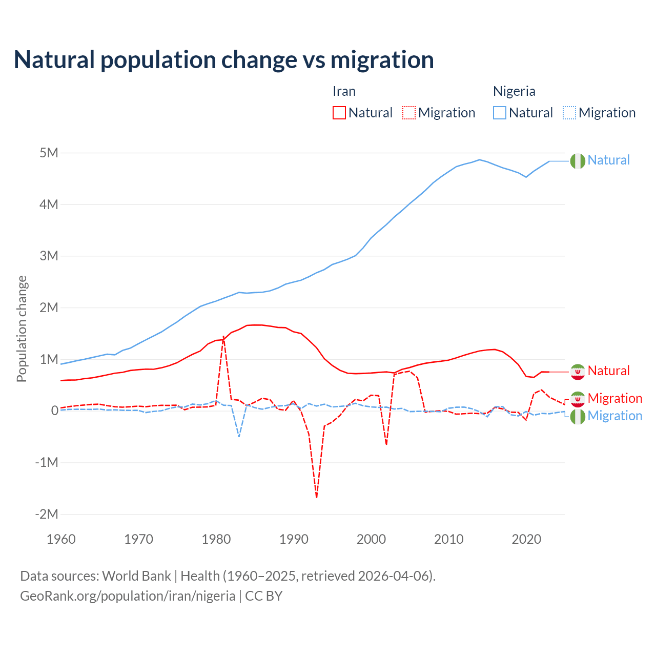 Over the last 10 years, 92.5% of the population change in Iran is from natural causes (a gain of 9,405,860 people) and 7.46% is from migration (a gain of 757,979 people). In Nigeria 99.2% is from natural causes (a gain of 47,163,517 people) and 0.77% is from migration (a loss of 368,103 people).