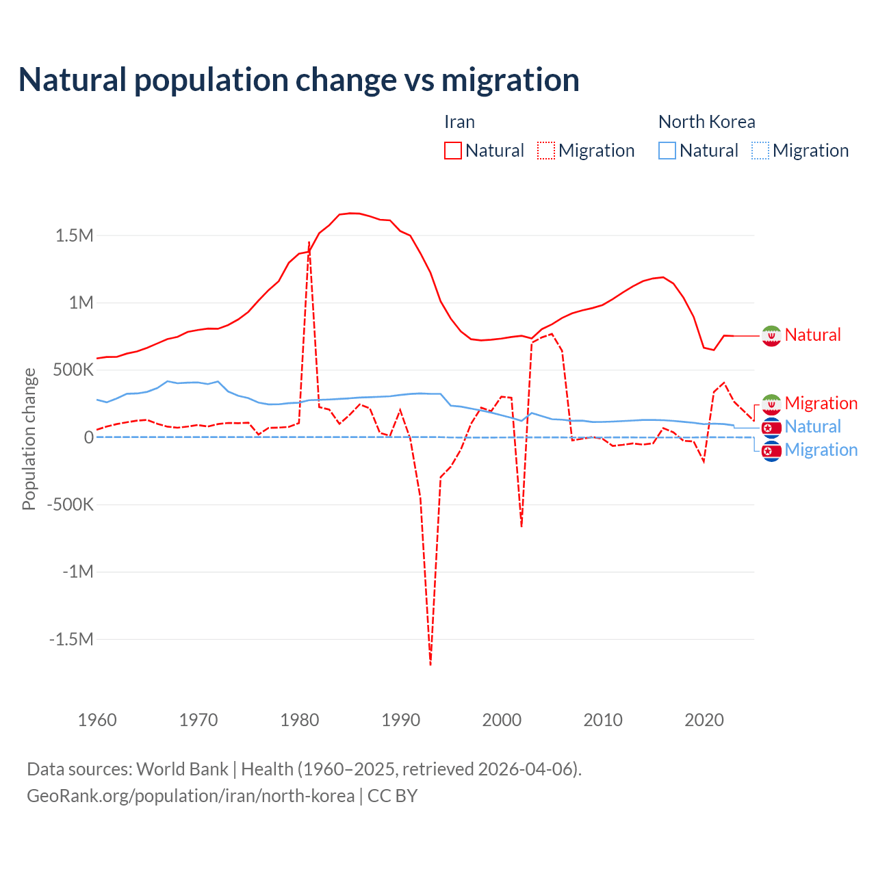Over the last 10 years, 92.5% of the population change in Iran is from natural causes (a gain of 9,405,860 people) and 7.46% is from migration (a gain of 757,979 people). In North Korea 97.7% is from natural causes (a gain of 1,097,372 people) and 2.33% is from migration (a loss of 26,227 people).
