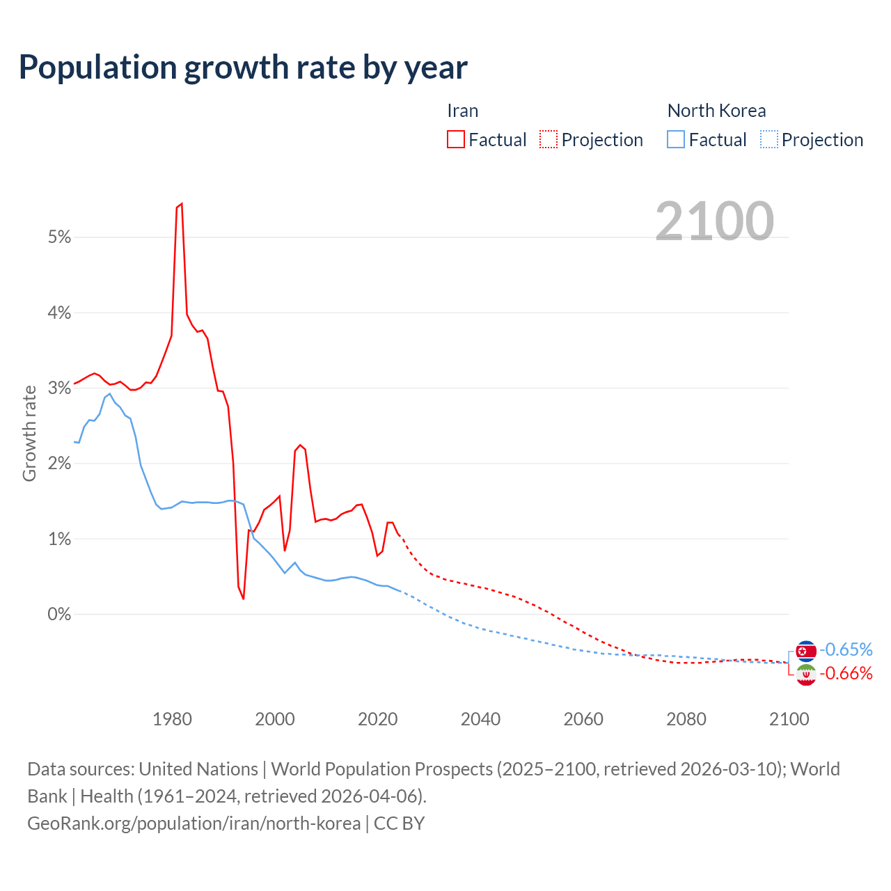 - For the last 10 years, Iran has had an average growth rate of +1.19% per year vs +0.41% in North Korea.