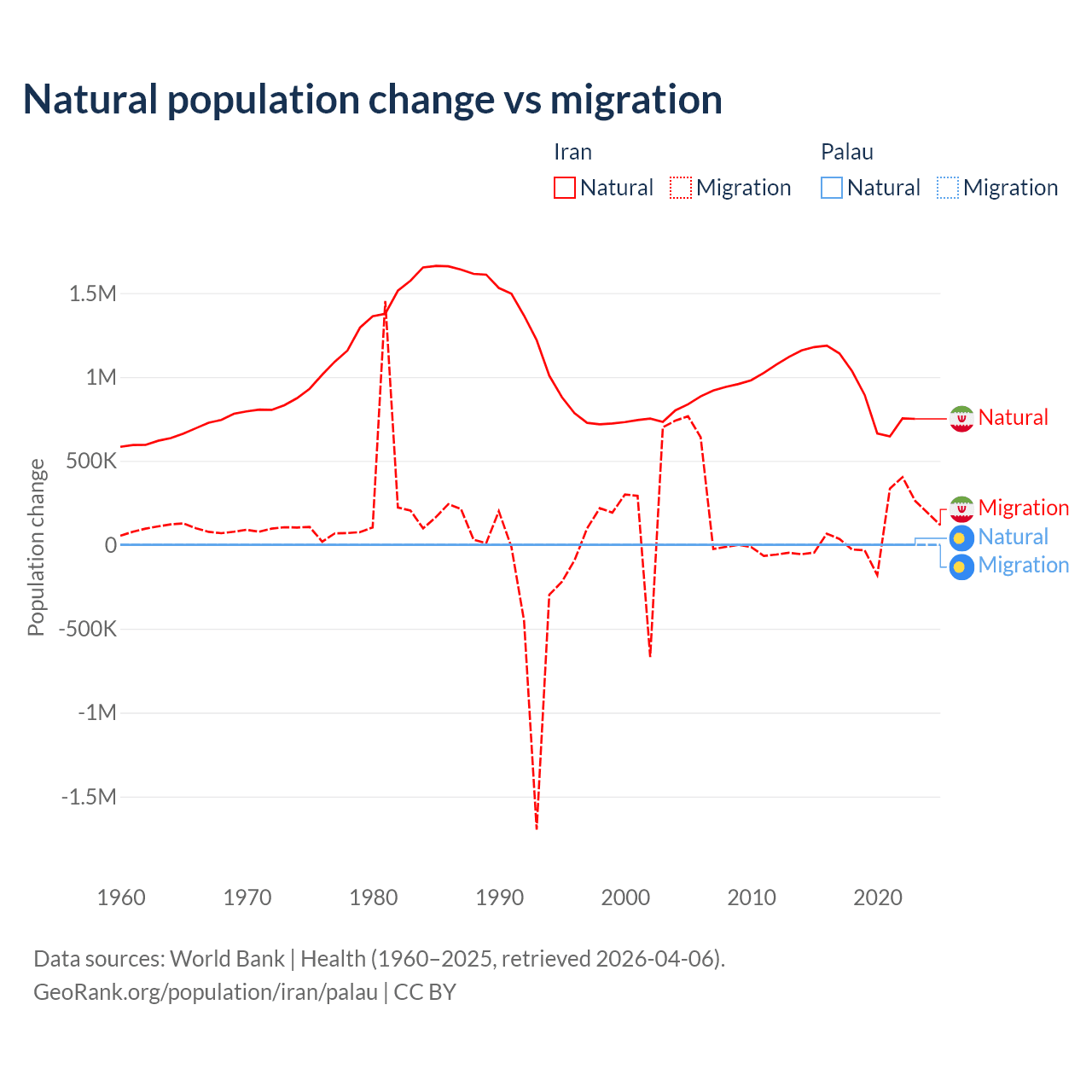Over the last 10 years, 92.5% of the population change in Iran is from natural causes (a gain of 9,405,860 people) and 7.46% is from migration (a gain of 757,979 people). In Palau 53.8% is from natural causes (a gain of 264 people) and 46.2% is from migration (a loss of 227 people).