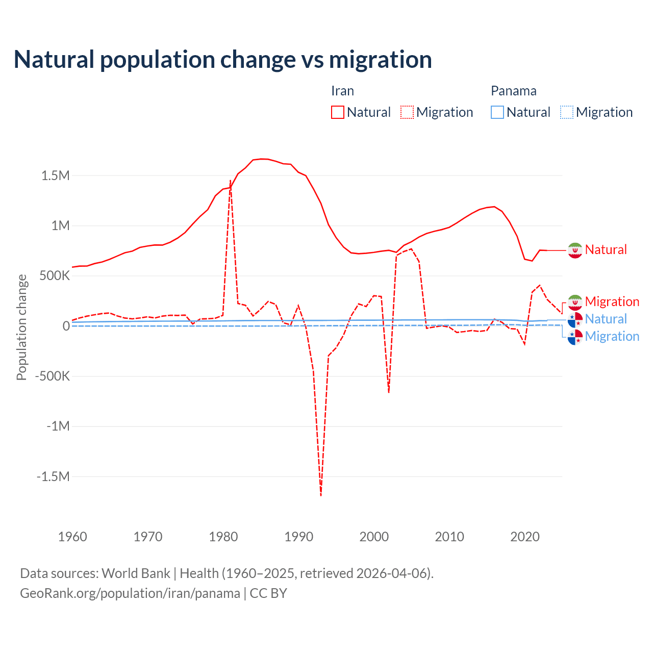 Over the last 10 years, 92.5% of the population change in Iran is from natural causes (a gain of 9,405,860 people) and 7.46% is from migration (a gain of 757,979 people). In Panama 86.5% is from natural causes (a gain of 544,211 people) and 13.5% is from migration (a gain of 84,849 people).