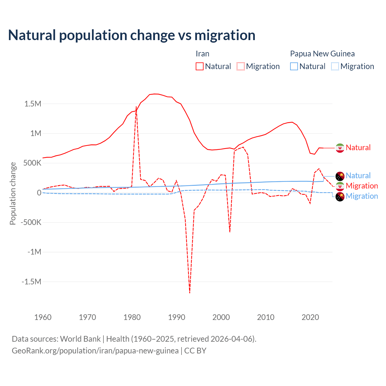 Over the last 10 years, 92.5% of the population change in Iran is from natural causes (a gain of 9,405,860 people) and 7.46% is from migration (a gain of 757,979 people). In Papua New Guinea 91% is from natural causes (a gain of 1,883,906 people) and 8.98% is from migration (a gain of 185,900 people).