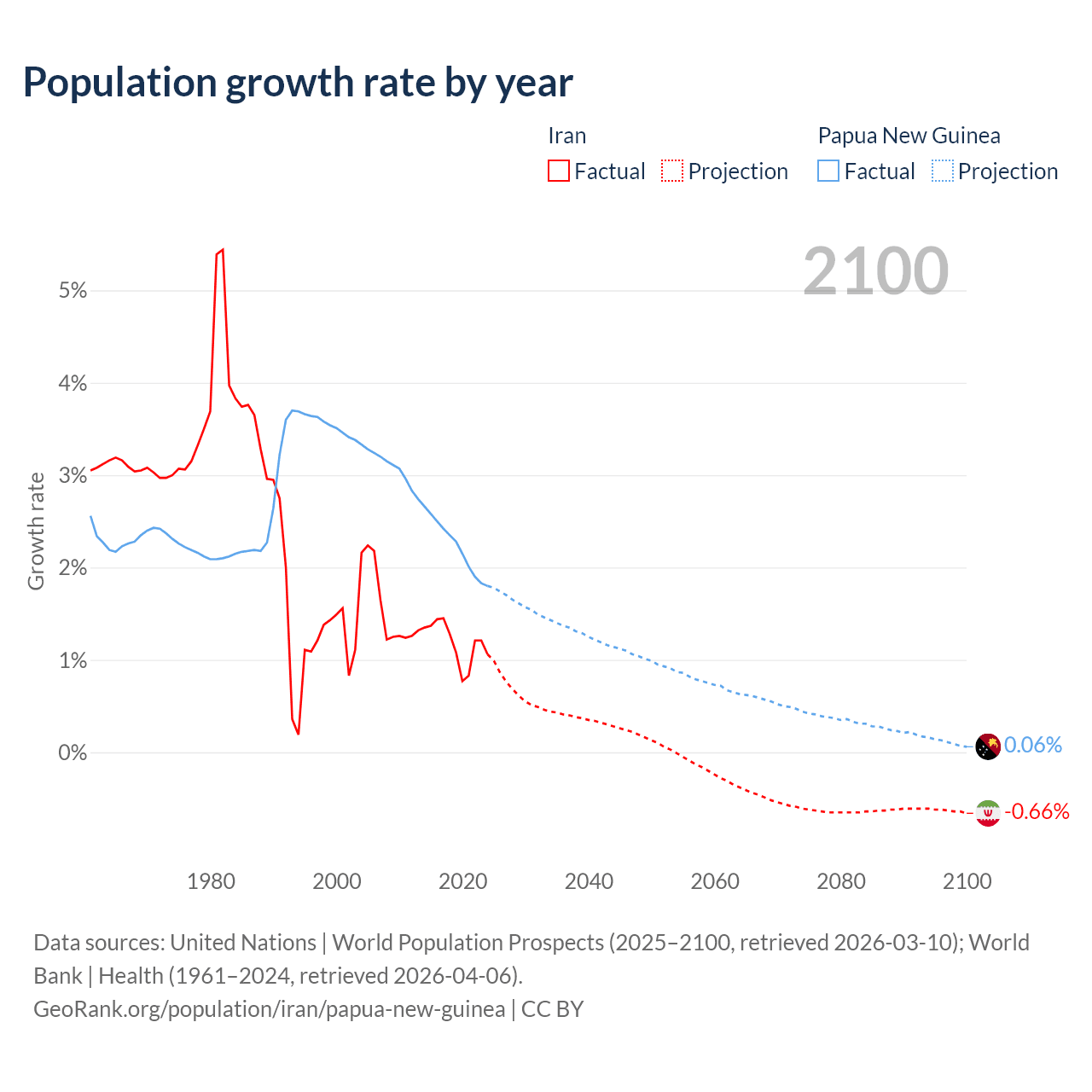 - For the last 10 years, Iran has had an average growth rate of +1.19% per year vs +2.23% in Papua New Guinea.