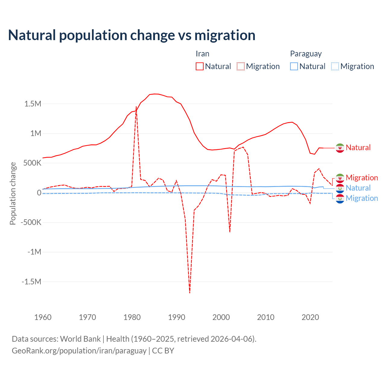 Over the last 10 years, 92.5% of the population change in Iran is from natural causes (a gain of 9,405,860 people) and 7.46% is from migration (a gain of 757,979 people). In Paraguay 87.6% is from natural causes (a gain of 1,002,636 people) and 12.4% is from migration (a loss of 141,377 people).
