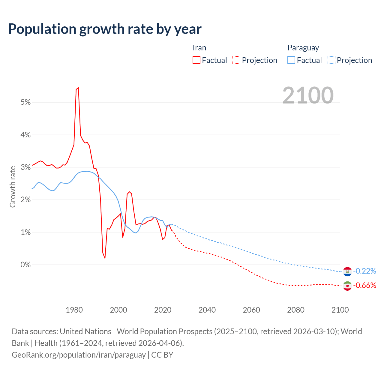 - For the last 10 years, Iran has had an average growth rate of +1.19% per year vs +1.34% in Paraguay.