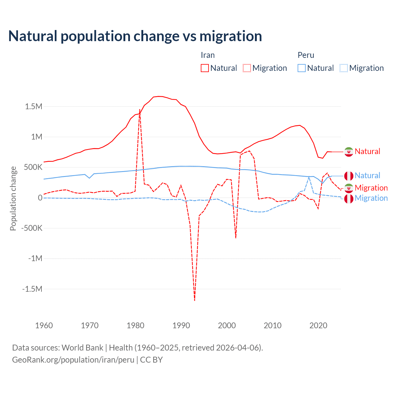 Over the last 10 years, 92.5% of the population change in Iran is from natural causes (a gain of 9,405,860 people) and 7.46% is from migration (a gain of 757,979 people). In Peru 82% is from natural causes (a gain of 3,345,822 people) and 18% is from migration (a gain of 732,505 people).