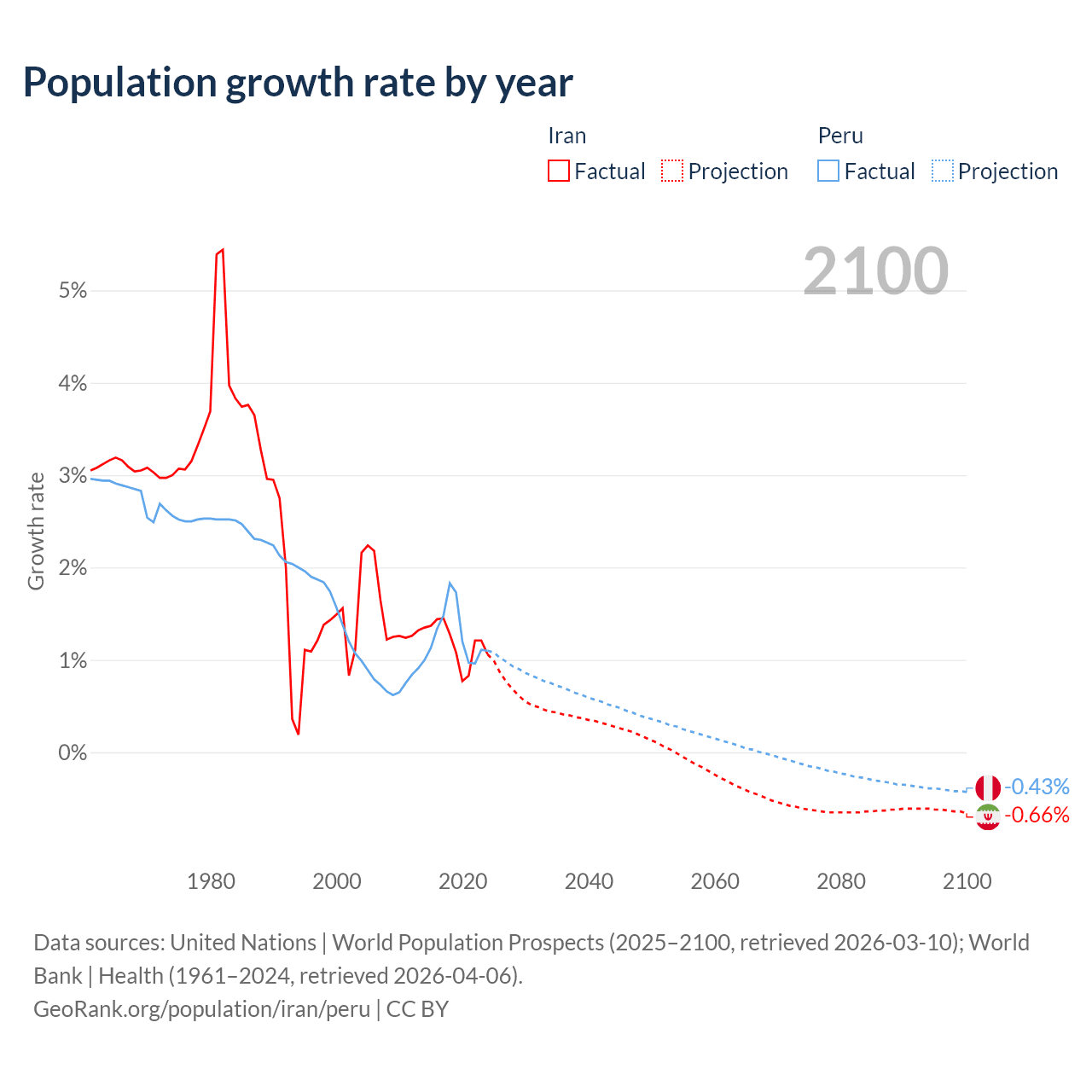 - For the last 10 years, Iran has had an average growth rate of +1.19% per year vs +1.26% in Peru.