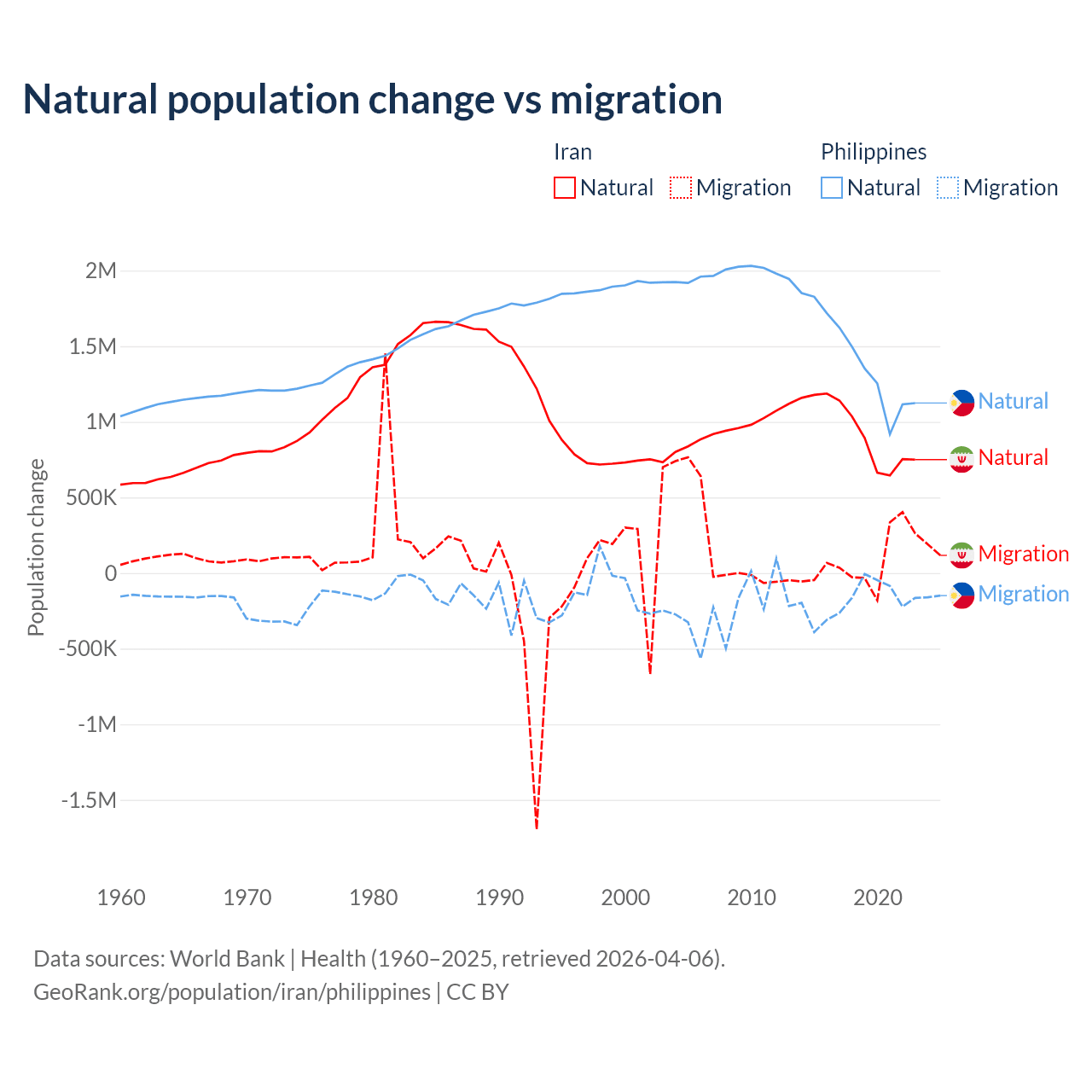 Over the last 10 years, 92.5% of the population change in Iran is from natural causes (a gain of 9,405,860 people) and 7.46% is from migration (a gain of 757,979 people). In the Philippines 88.5% is from natural causes (a gain of 14,279,705 people) and 11.5% is from migration (a loss of 1,848,117 people).
