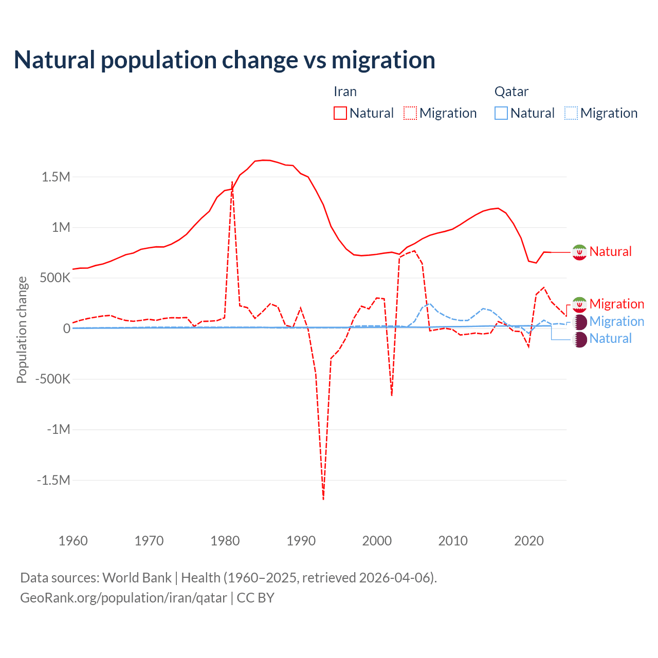 Over the last 10 years, 92.5% of the population change in Iran is from natural causes (a gain of 9,405,860 people) and 7.46% is from migration (a gain of 757,979 people). In Qatar 26.1% is from natural causes (a gain of 232,009 people) and 73.9% is from migration (a gain of 655,712 people).