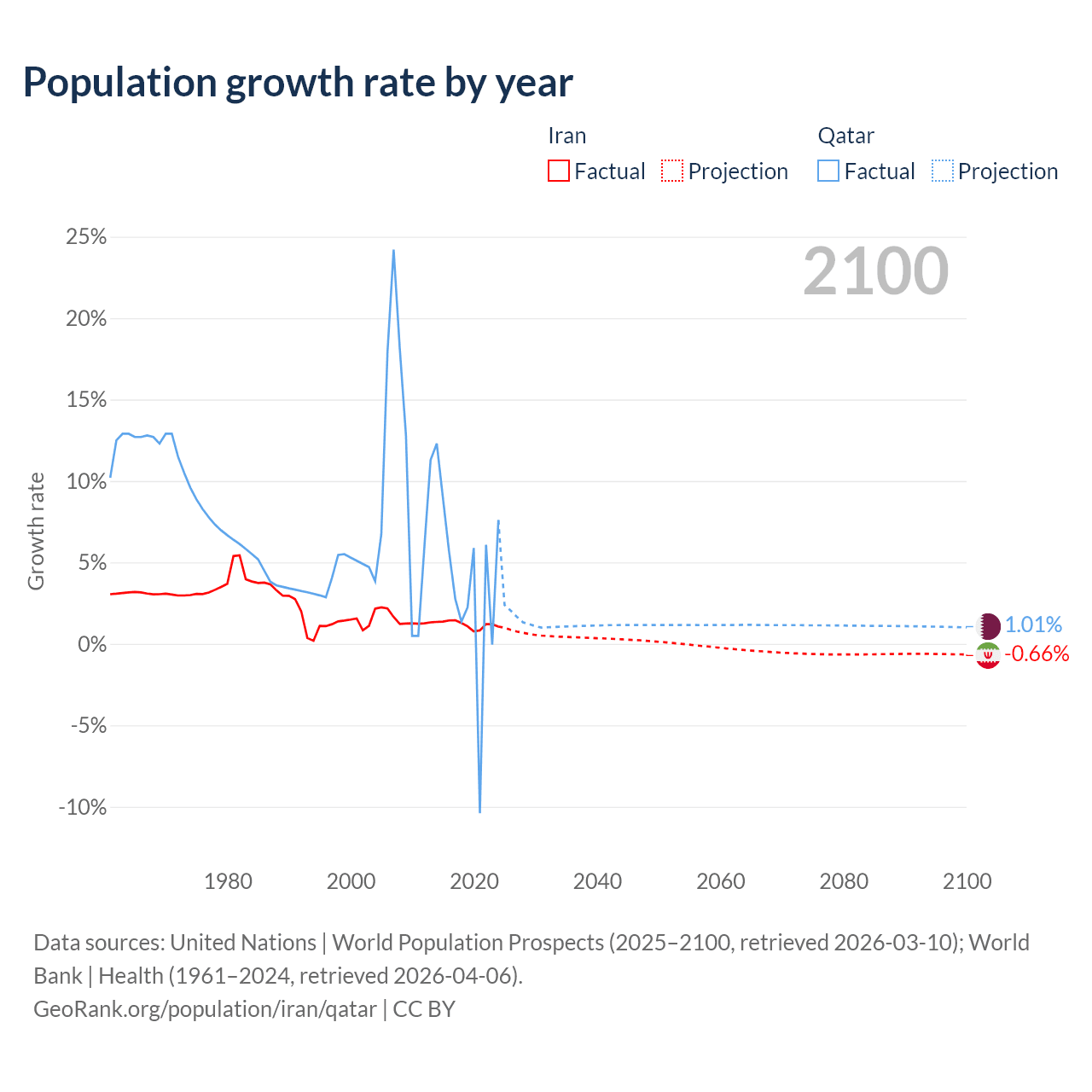 - For the last 10 years, Iran has had an average growth rate of +1.19% per year vs +3.86% in Qatar.