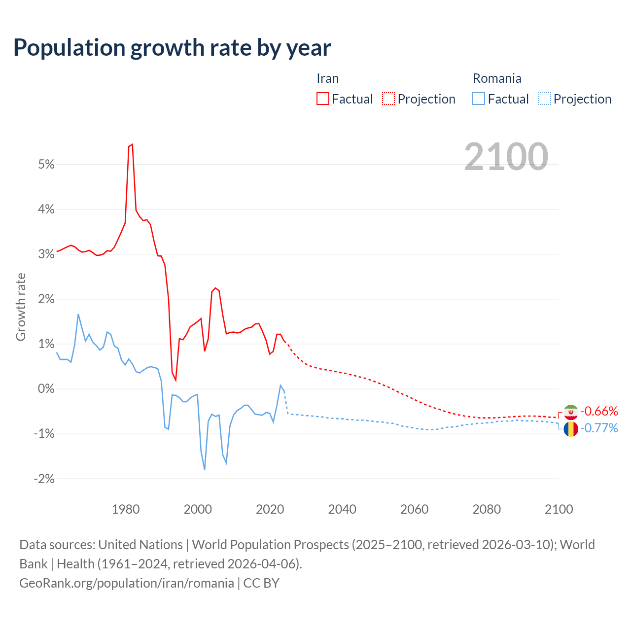 - For the last 10 years, Iran has had an average growth rate of +1.19% per year vs -0.43% in Romania.