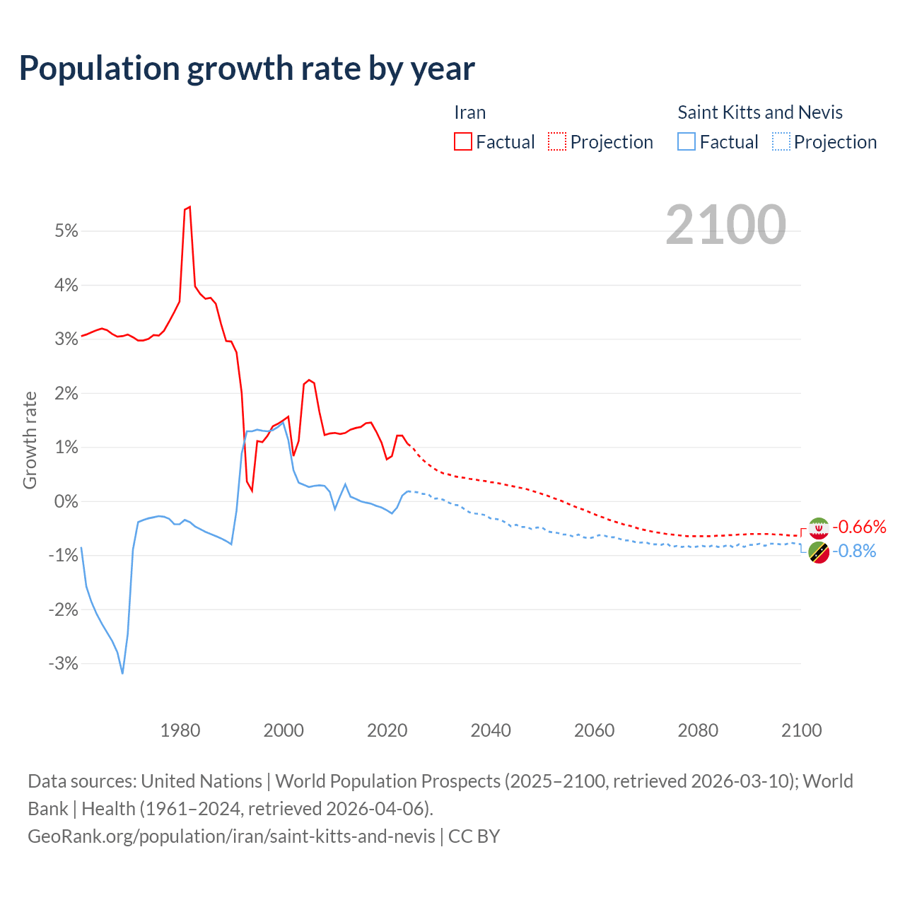 - For the last 10 years, Iran has had an average growth rate of +1.19% per year vs -0.04% in Saint Kitts and Nevis.