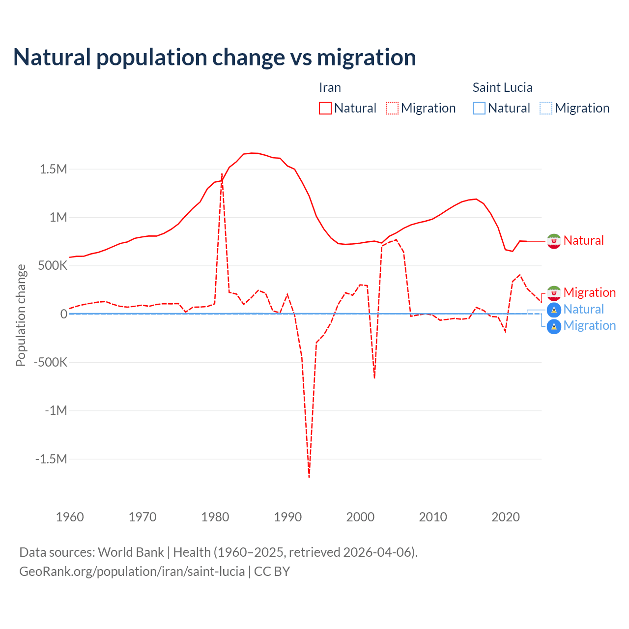 Over the last 10 years, 92.5% of the population change in Iran is from natural causes (a gain of 9,405,860 people) and 7.46% is from migration (a gain of 757,979 people). In Saint Lucia 95.7% is from natural causes (a gain of 6,039 people) and 4.31% is from migration (a loss of 272 people).