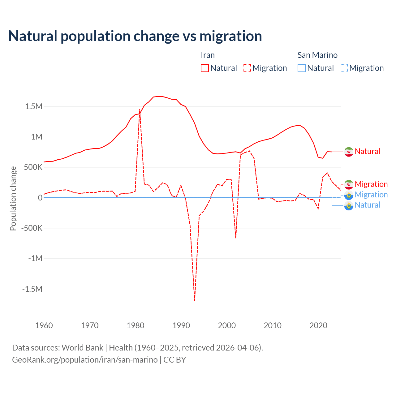 Over the last 10 years, 92.5% of the population change in Iran is from natural causes (a gain of 9,405,860 people) and 7.46% is from migration (a gain of 757,979 people). In San Marino 40.9% is from natural causes (a loss of 358 people) and 59.1% is from migration (a gain of 517 people).