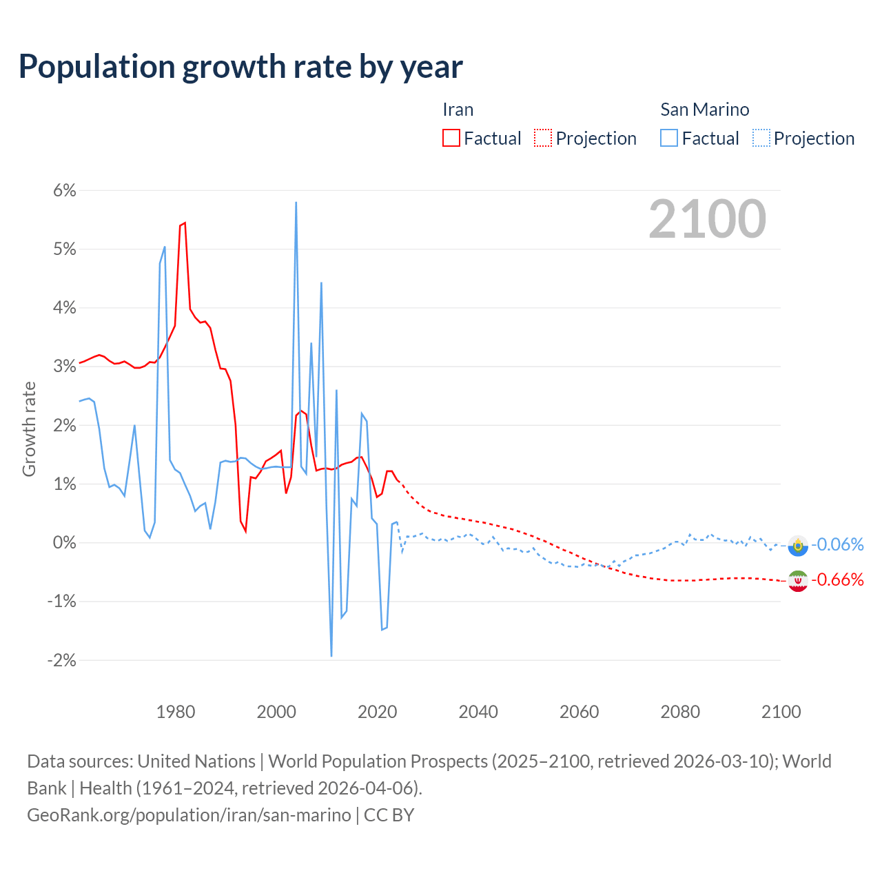 Data sources: World Bank | Health (1960–2024, retrieved 2026-04-06); United Nations | World Population Prospects (1960–2026, retrieved 2026-03-10); U.S. Census Bureau (1960–2025, retrieved 2026-02-08); Central Intelligence Agency (CIA) (2000–2019, retrieved 2026-02-20).