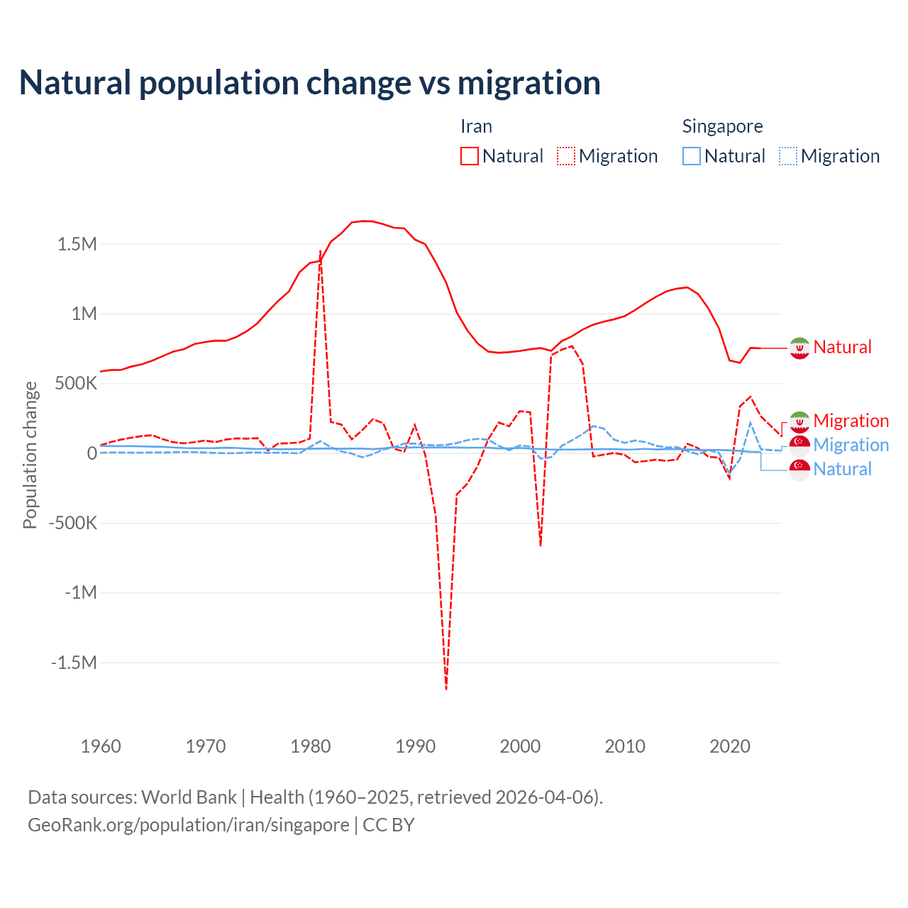 Over the last 10 years, 92.5% of the population change in Iran is from natural causes (a gain of 9,405,860 people) and 7.46% is from migration (a gain of 757,979 people). In Singapore 54.8% is from natural causes (a gain of 195,953 people) and 45.2% is from migration (a gain of 161,805 people).