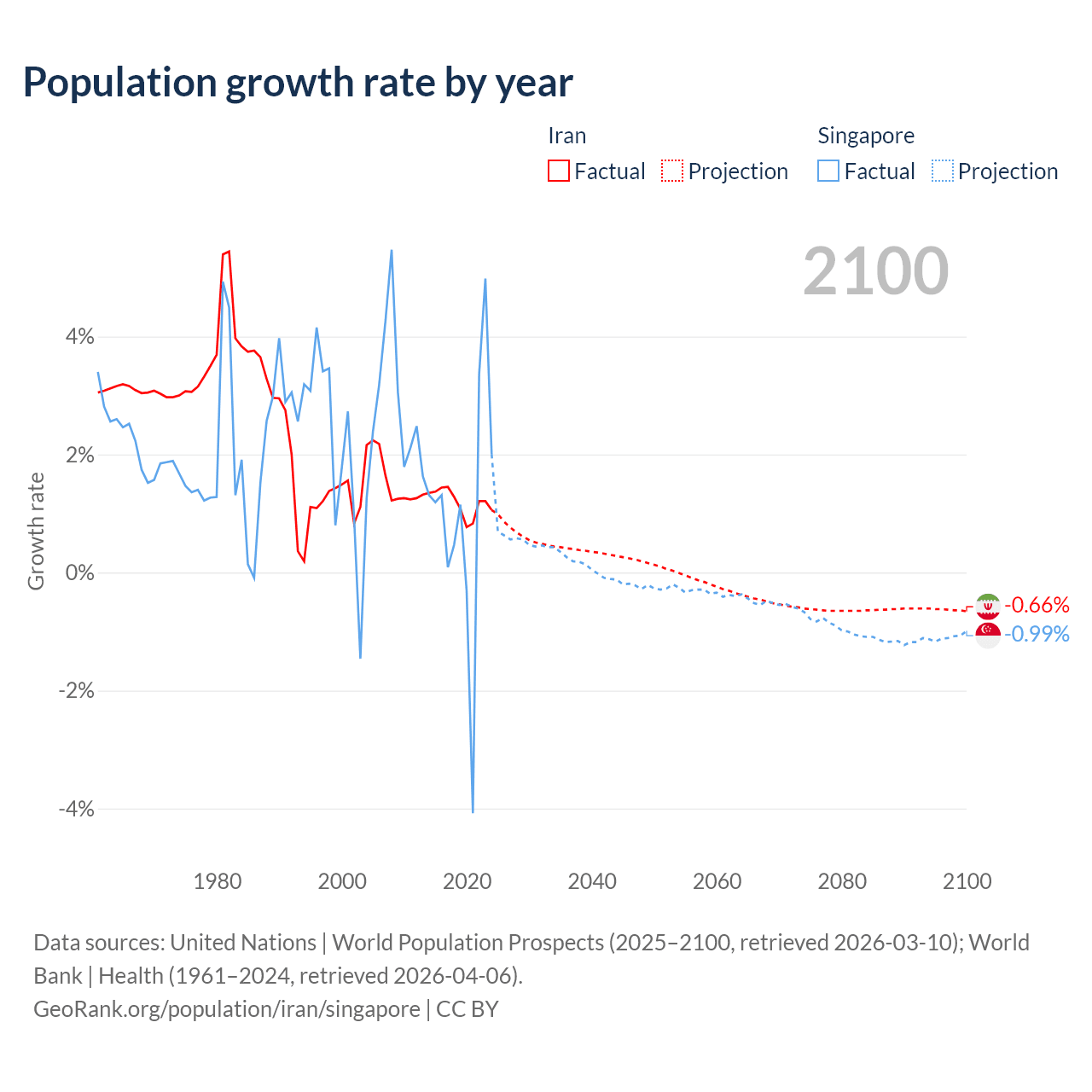 - For the last 10 years, Iran has had an average growth rate of +1.19% per year vs +1.04% in Singapore.