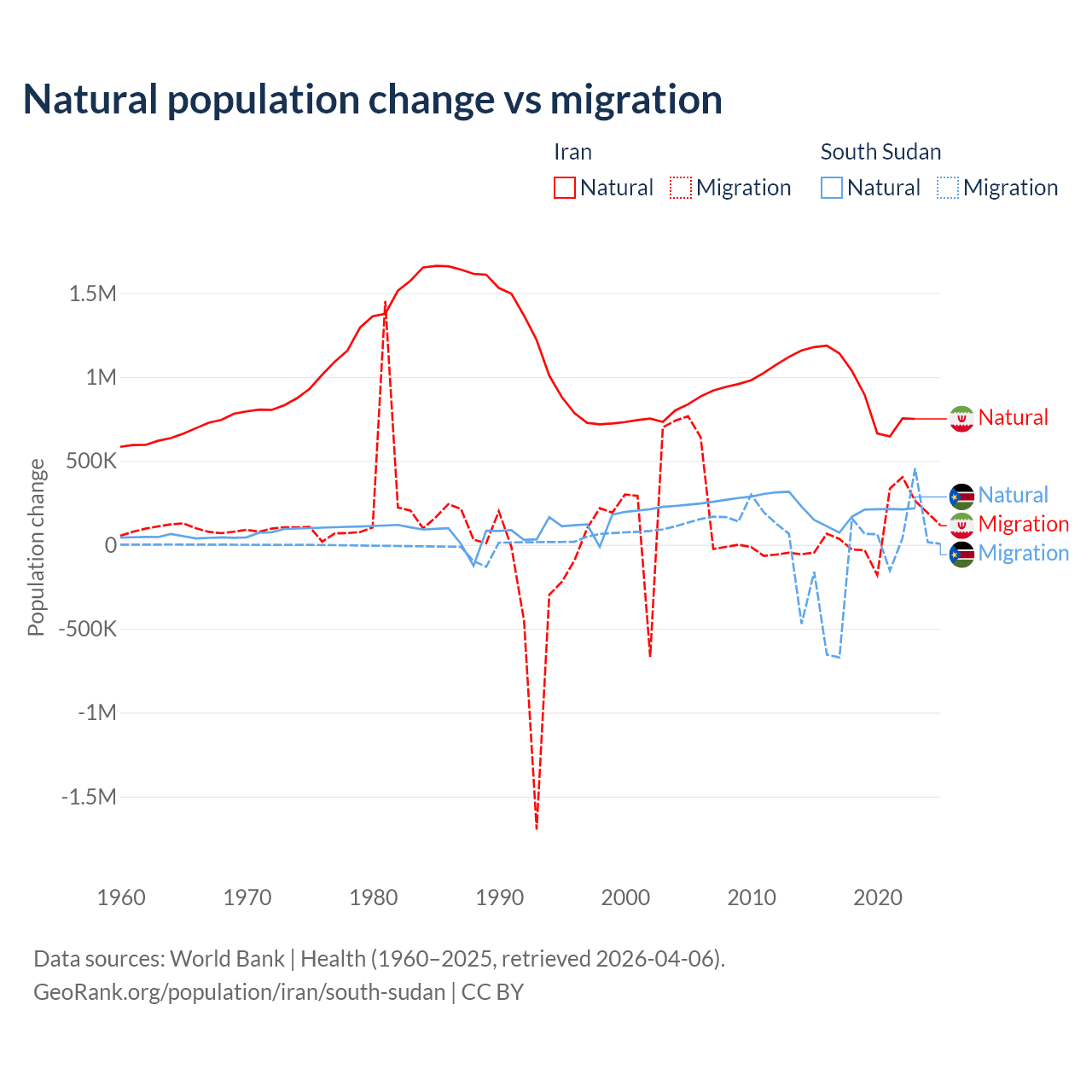 Over the last 10 years, 92.5% of the population change in Iran is from natural causes (a gain of 9,405,860 people) and 7.46% is from migration (a gain of 757,979 people). In South Sudan 57.4% is from natural causes (a gain of 1,792,135 people) and 42.6% is from migration (a loss of 1,329,606 people).