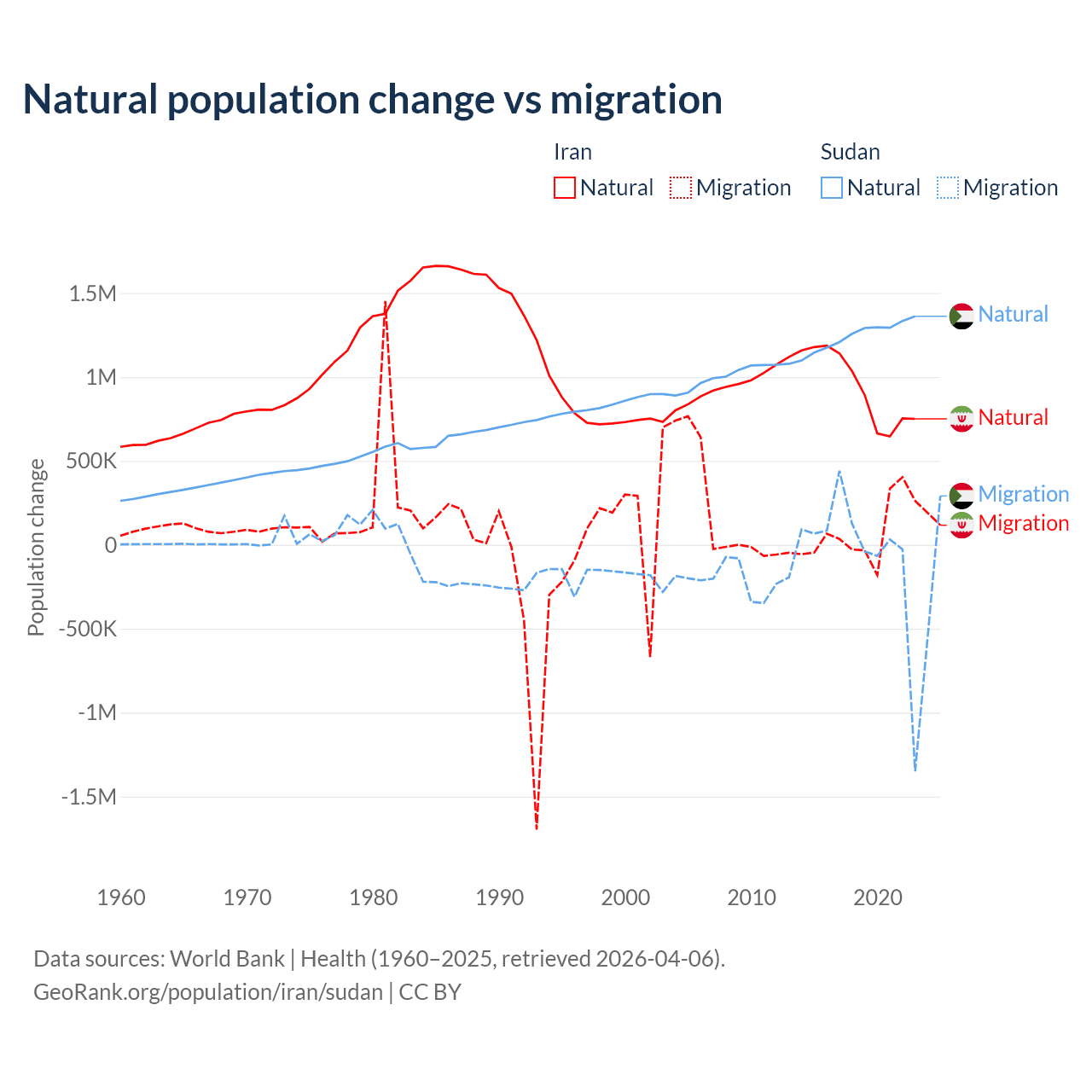 Over the last 10 years, 92.5% of the population change in Iran is from natural causes (a gain of 9,405,860 people) and 7.46% is from migration (a gain of 757,979 people). In Sudan 95.1% is from natural causes (a gain of 12,459,977 people) and 4.88% is from migration (a loss of 639,596 people).