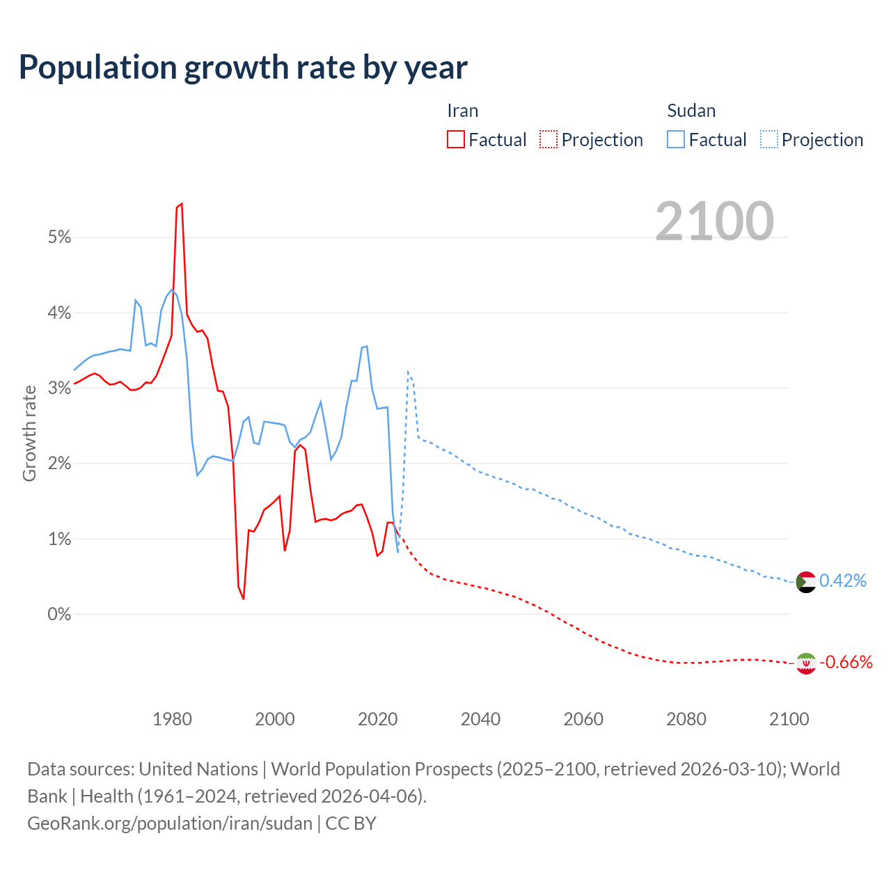 - For the last 10 years, Iran has had an average growth rate of +1.19% per year vs +2.67% in Sudan.