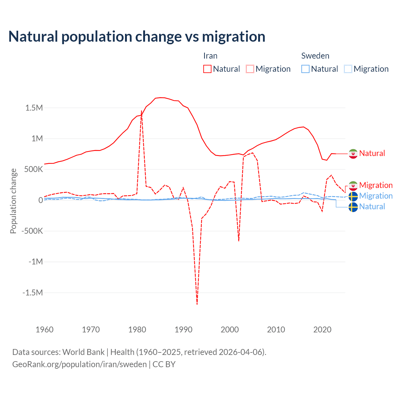 Over the last 10 years, 92.5% of the population change in Iran is from natural causes (a gain of 9,405,860 people) and 7.46% is from migration (a gain of 757,979 people). In Sweden 21.4% is from natural causes (a gain of 201,900 people) and 78.6% is from migration (a gain of 743,642 people).