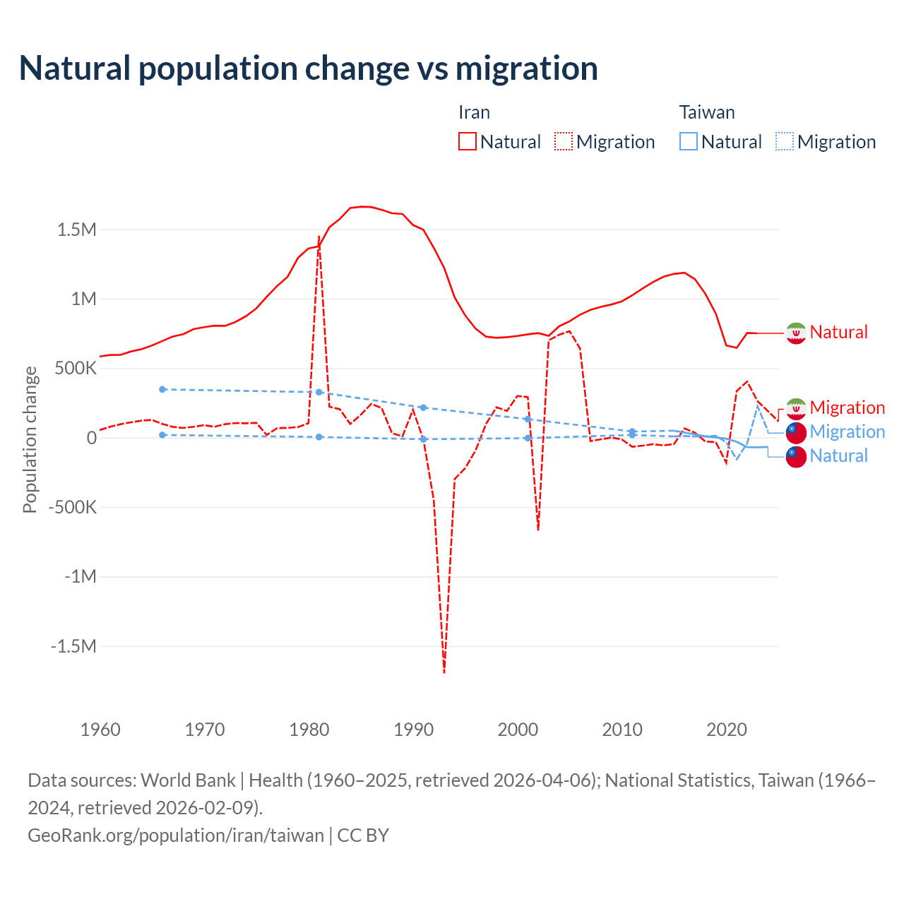 Over the last 10 years, 92.5% of the population change in Iran is from natural causes (a gain of 9,405,860 people) and 7.46% is from migration (a gain of 757,979 people). In Taiwan 56.7% is from natural causes (a loss of 57,467 people) and 43.3% is from migration (a gain of 43,884 people).