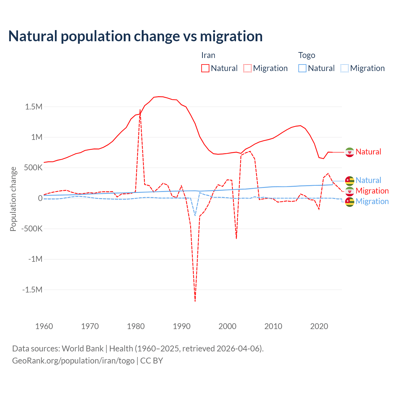 Over the last 10 years, 92.5% of the population change in Iran is from natural causes (a gain of 9,405,860 people) and 7.46% is from migration (a gain of 757,979 people). In Togo 99.1% is from natural causes (a gain of 2,052,115 people) and 0.86% is from migration (a loss of 17,852 people).