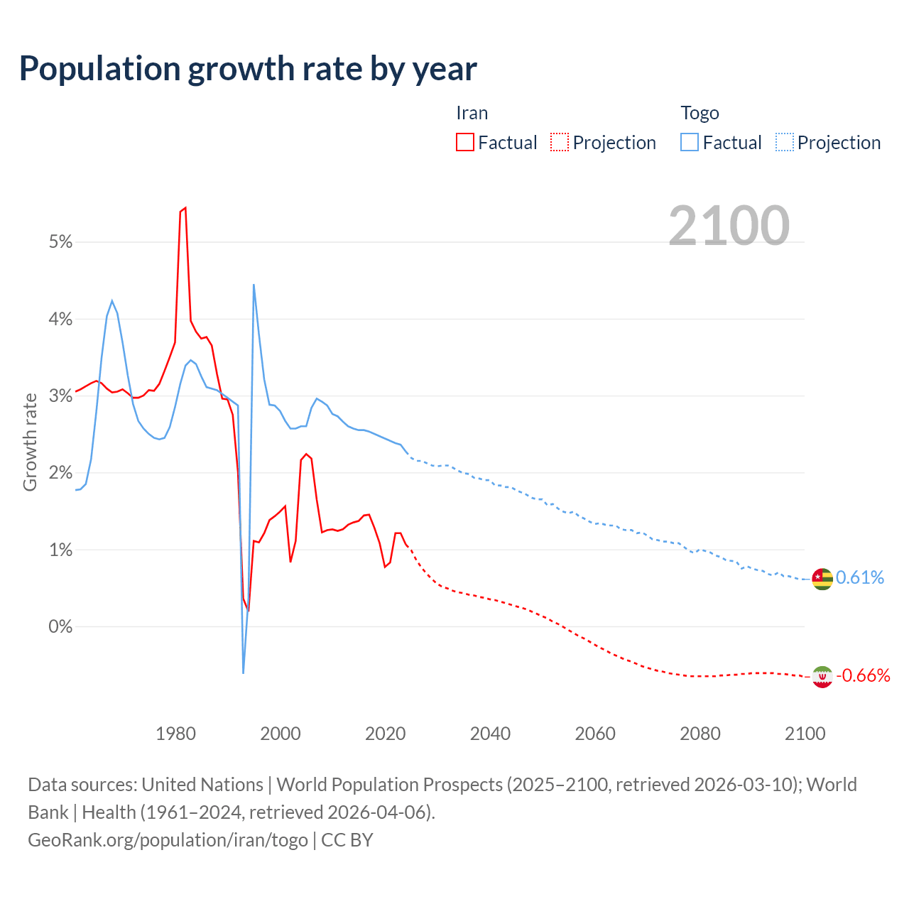 - For the last 10 years, Iran has had an average growth rate of +1.19% per year vs +2.46% in Togo.