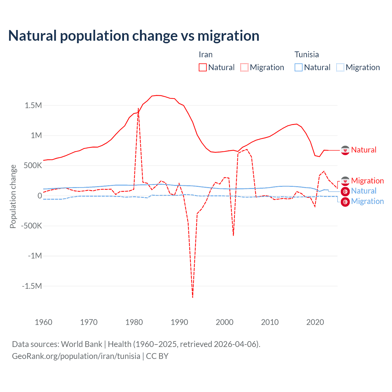 Over the last 10 years, 92.5% of the population change in Iran is from natural causes (a gain of 9,405,860 people) and 7.46% is from migration (a gain of 757,979 people). In Tunisia 86.3% is from natural causes (a gain of 1,225,079 people) and 13.7% is from migration (a loss of 195,011 people).