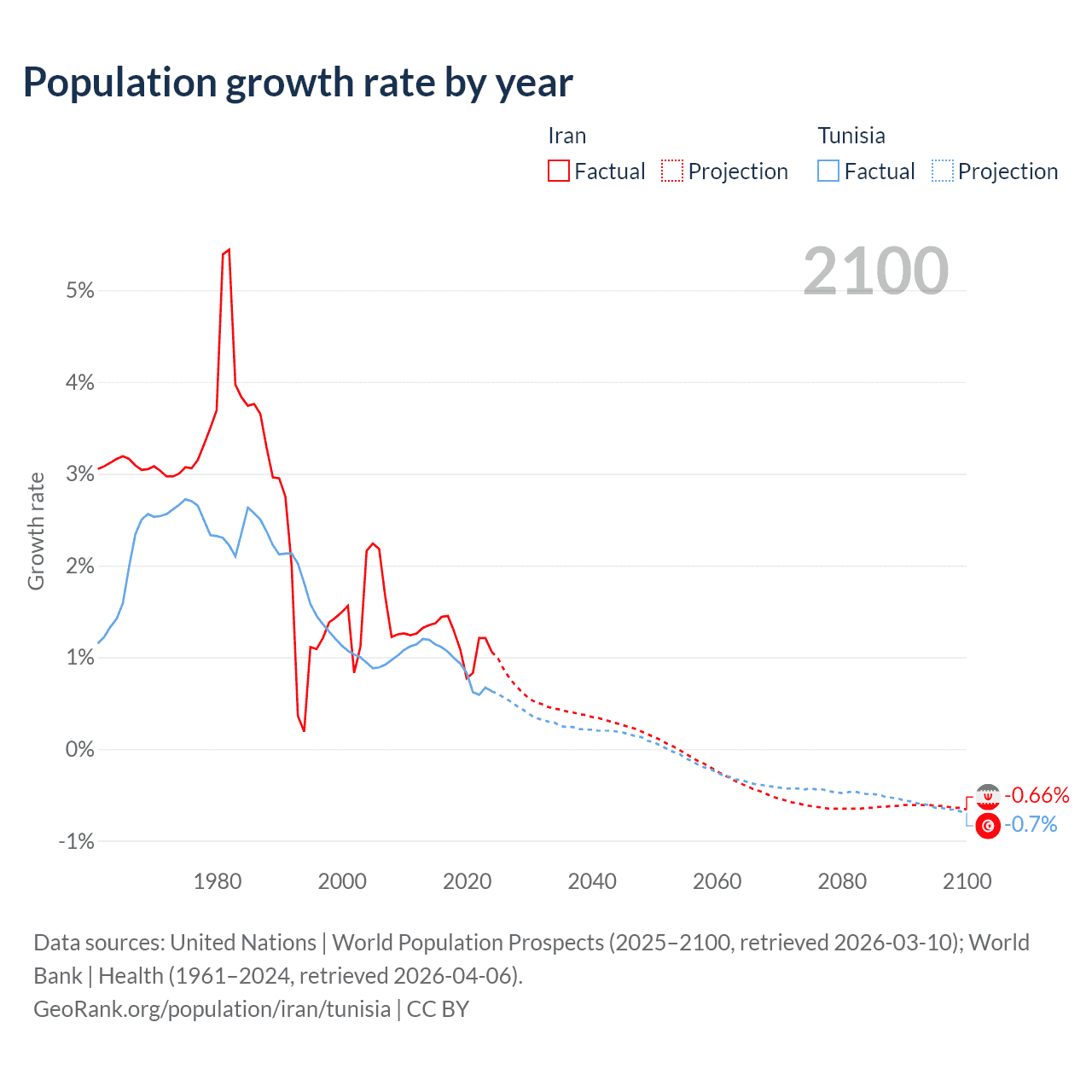 - For the last 10 years, Iran has had an average growth rate of +1.19% per year vs +0.89% in Tunisia.
