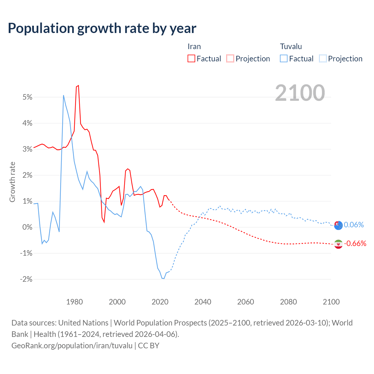 - For the last 10 years, Iran has had an average growth rate of +1.19% per year vs -1.19% in Tuvalu.