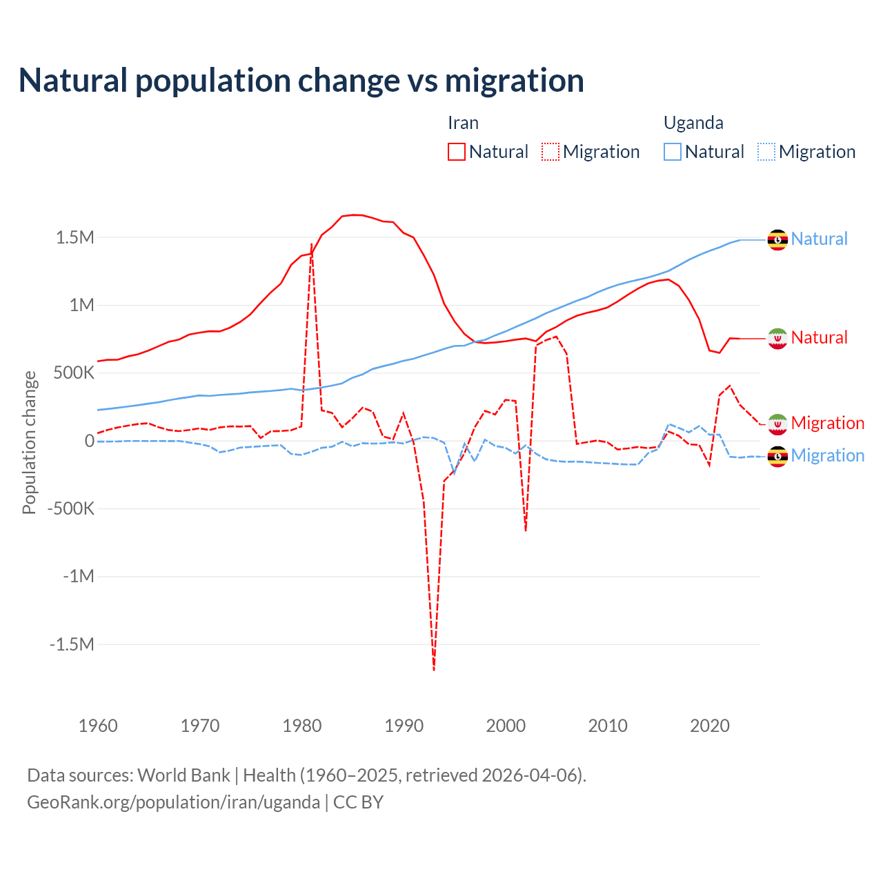 Over the last 10 years, 92.5% of the population change in Iran is from natural causes (a gain of 9,405,860 people) and 7.46% is from migration (a gain of 757,979 people). In Uganda 99.5% is from natural causes (a gain of 13,419,712 people) and 0.53% is from migration (a gain of 71,457 people).