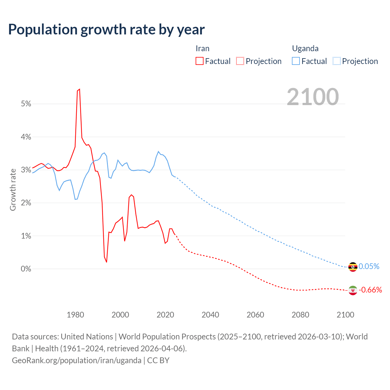 - For the last 10 years, Iran has had an average growth rate of +1.19% per year vs +3.21% in Uganda.