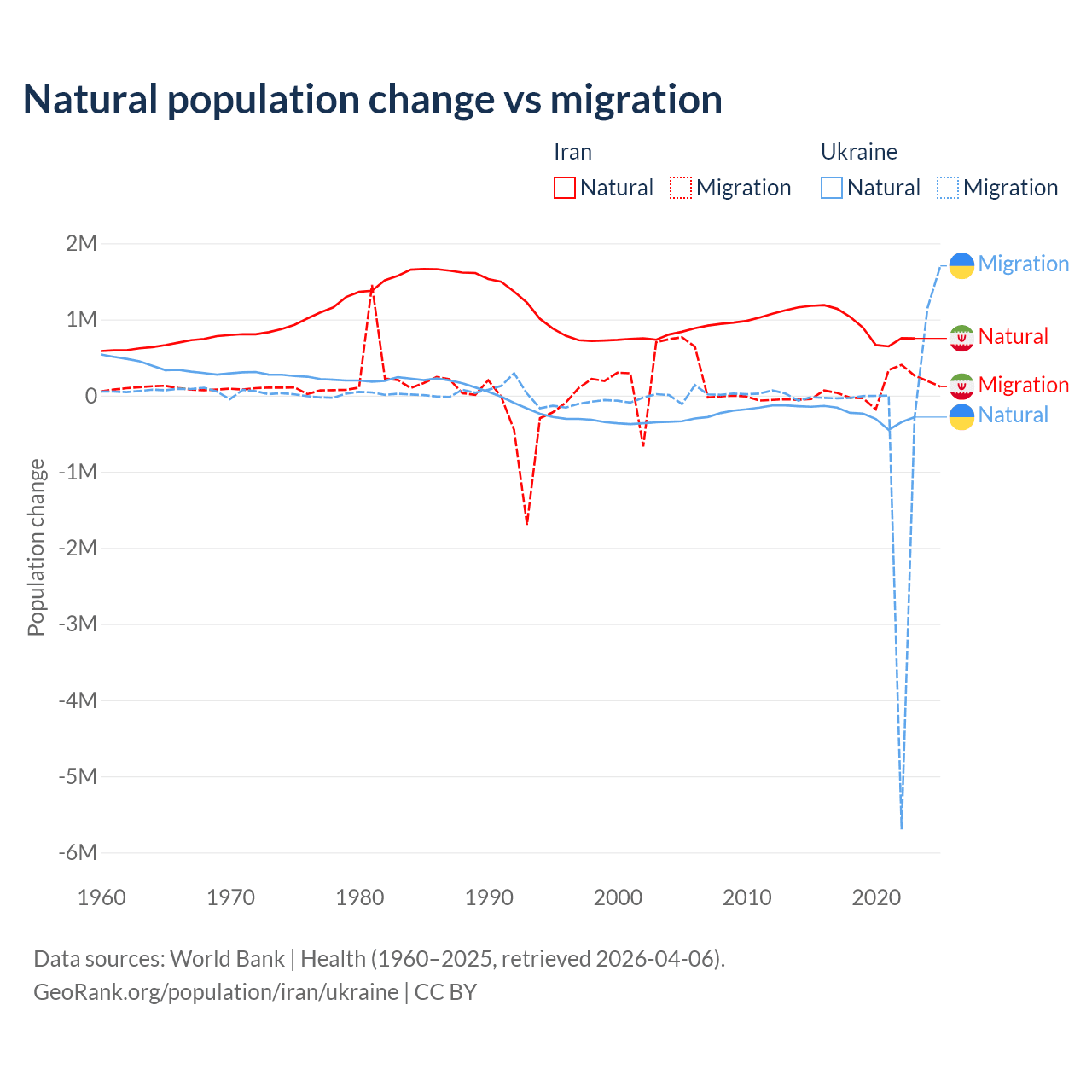 Over the last 10 years, 92.5% of the population change in Iran is from natural causes (a gain of 9,405,860 people) and 7.46% is from migration (a gain of 757,979 people). In Ukraine 28.2% is from natural causes (a loss of 2,435,153 people) and 71.8% is from migration (a loss of 6,198,995 people).