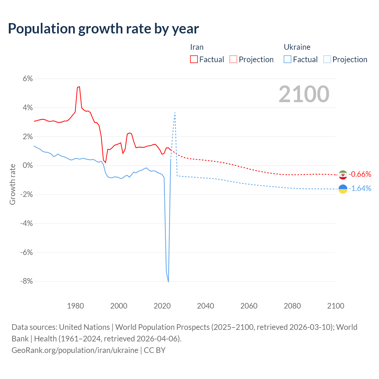 - For the last 10 years, Iran has had an average growth rate of +1.19% per year vs -1.74% in Ukraine.