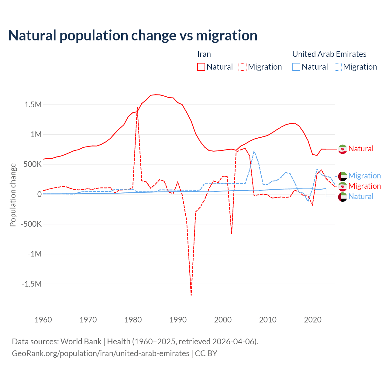 Over the last 10 years, 92.5% of the population change in Iran is from natural causes (a gain of 9,405,860 people) and 7.46% is from migration (a gain of 757,979 people). In the United Arab Emirates 30.5% is from natural causes (a gain of 857,996 people) and 69.5% is from migration (a gain of 1,958,520 people).