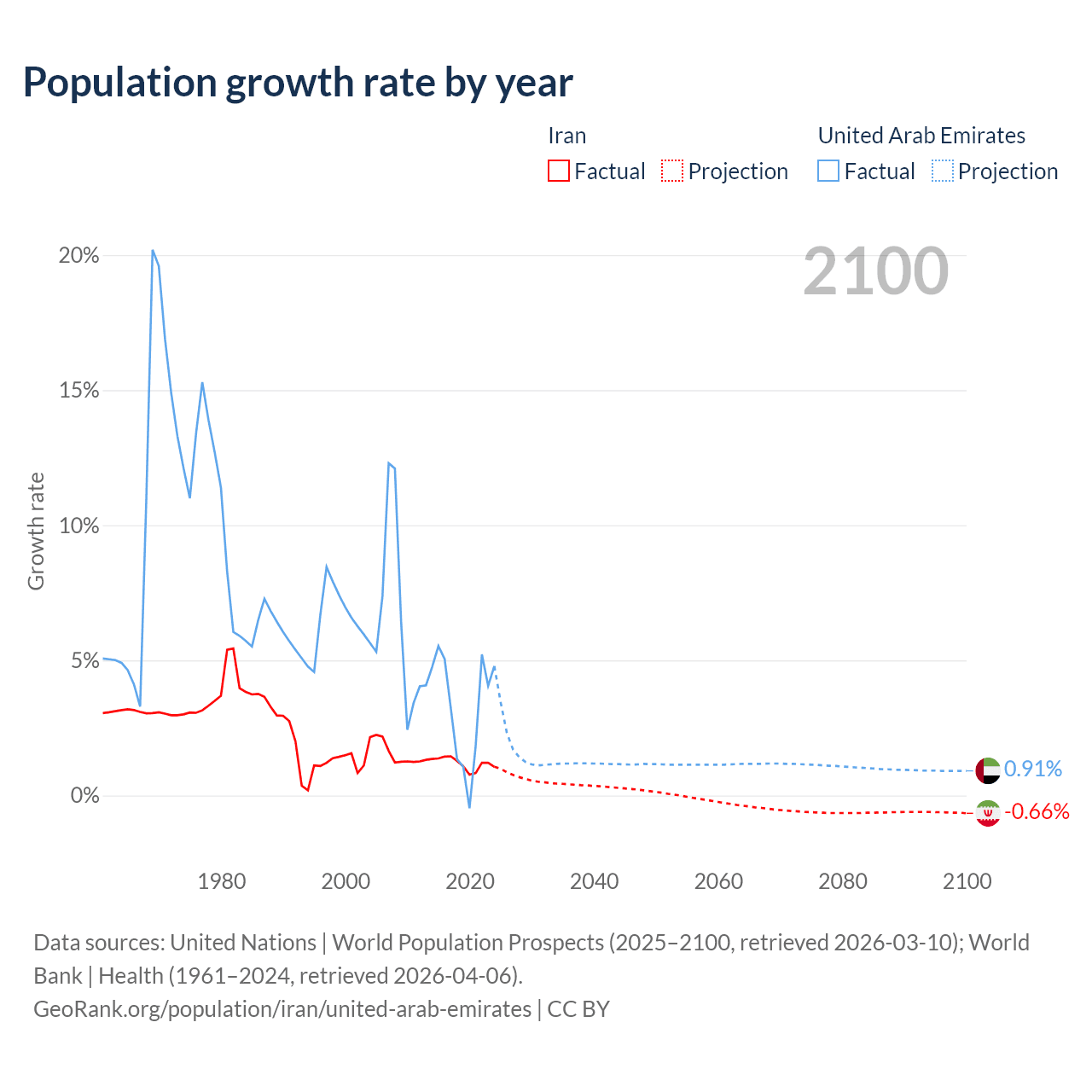 - For the last 10 years, Iran has had an average growth rate of +1.19% per year vs +3.31% in the United Arab Emirates.