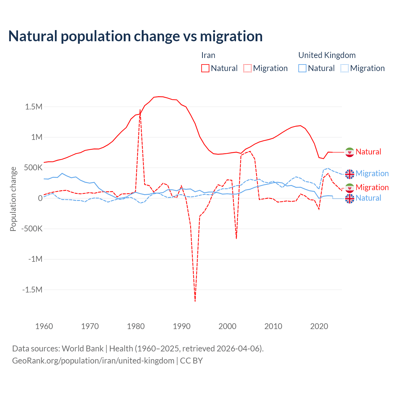 Over the last 10 years, 92.5% of the population change in Iran is from natural causes (a gain of 9,405,860 people) and 7.46% is from migration (a gain of 757,979 people). In the United Kingdom 23.9% is from natural causes (a gain of 1,033,129 people) and 76.1% is from migration (a gain of 3,283,101 people).