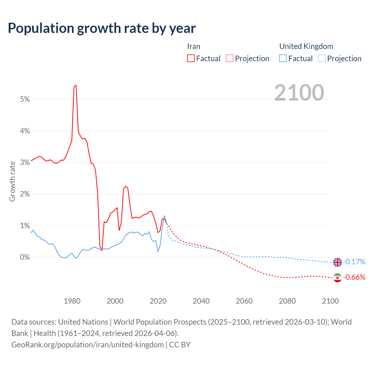 - For the last 10 years, Iran has had an average growth rate of +1.19% per year vs +0.7% in the United Kingdom.